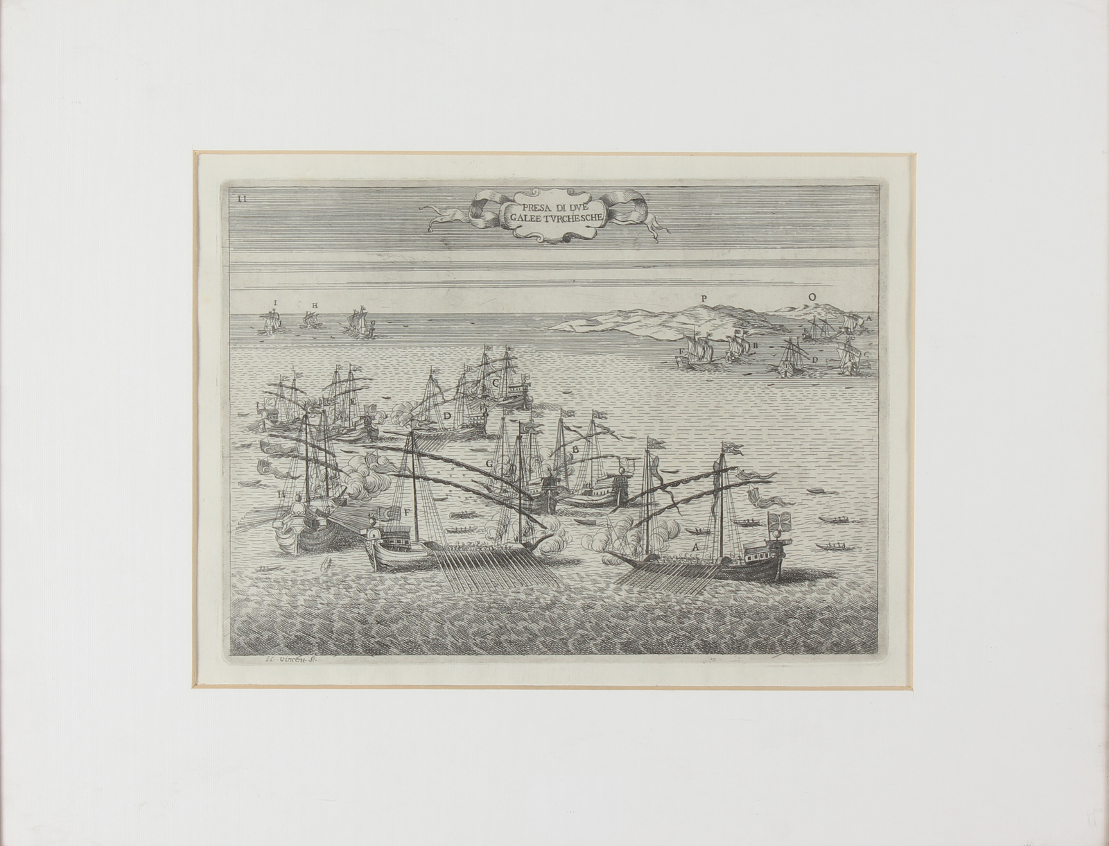 ARTISTA DEL XVIII SECOLO Presa di due galee turchesche, marine. 1701. Incisione su rame. Cm 21,00 x 28,00. Incisore H. Vincent. Firenze. Da P.M. Piccioni - M. Nestus. Tratto da Le imprese dei cavalieri di Santo Stefano. Al retro certificato di garanzia Galleria Magenta, Brescia. Cornice presente