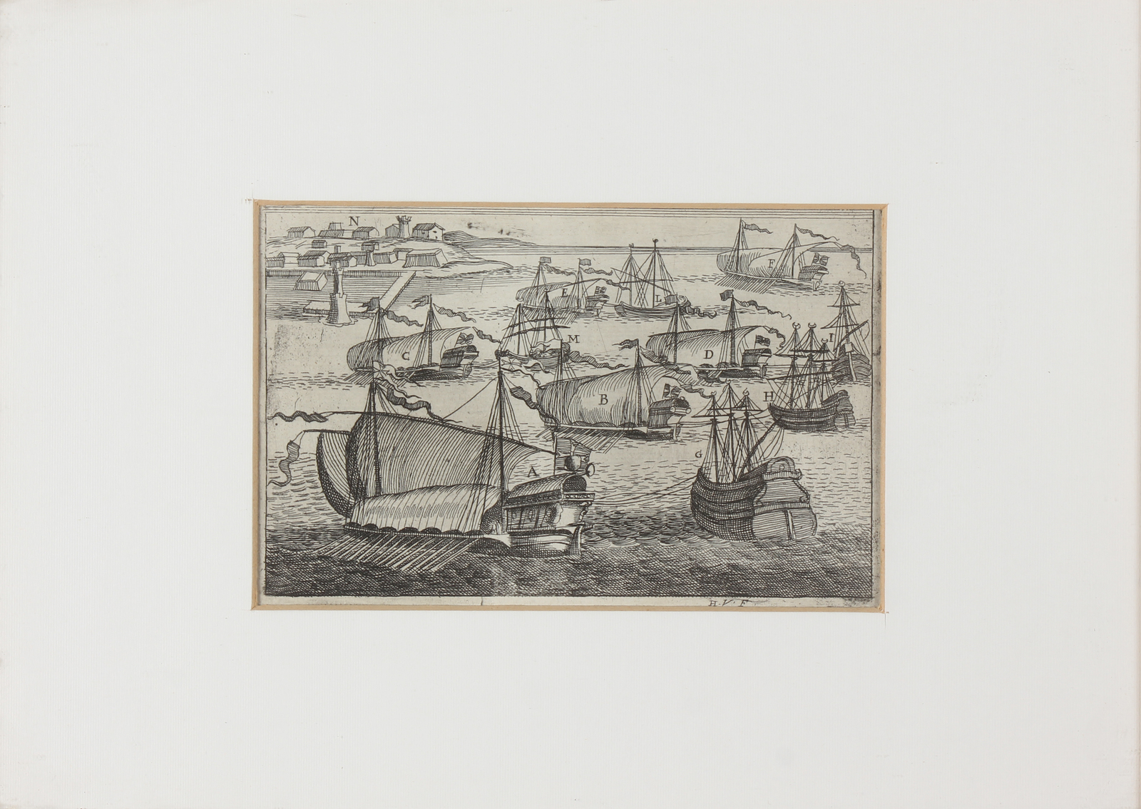 ARTISTA DEL XVIII SECOLO Navi in rada, marina. 1701. Incisione su rame. Cm 18,50 x 11,50. Incisore H. Vincent. Da P.M. Miccioni - M. Nestus. Firenze. Tratto da Le imprese dei cavalieri di Santo Stefano. Al retro certificato di garanzia Galleria Magenta, Brescia. . Cornice presente