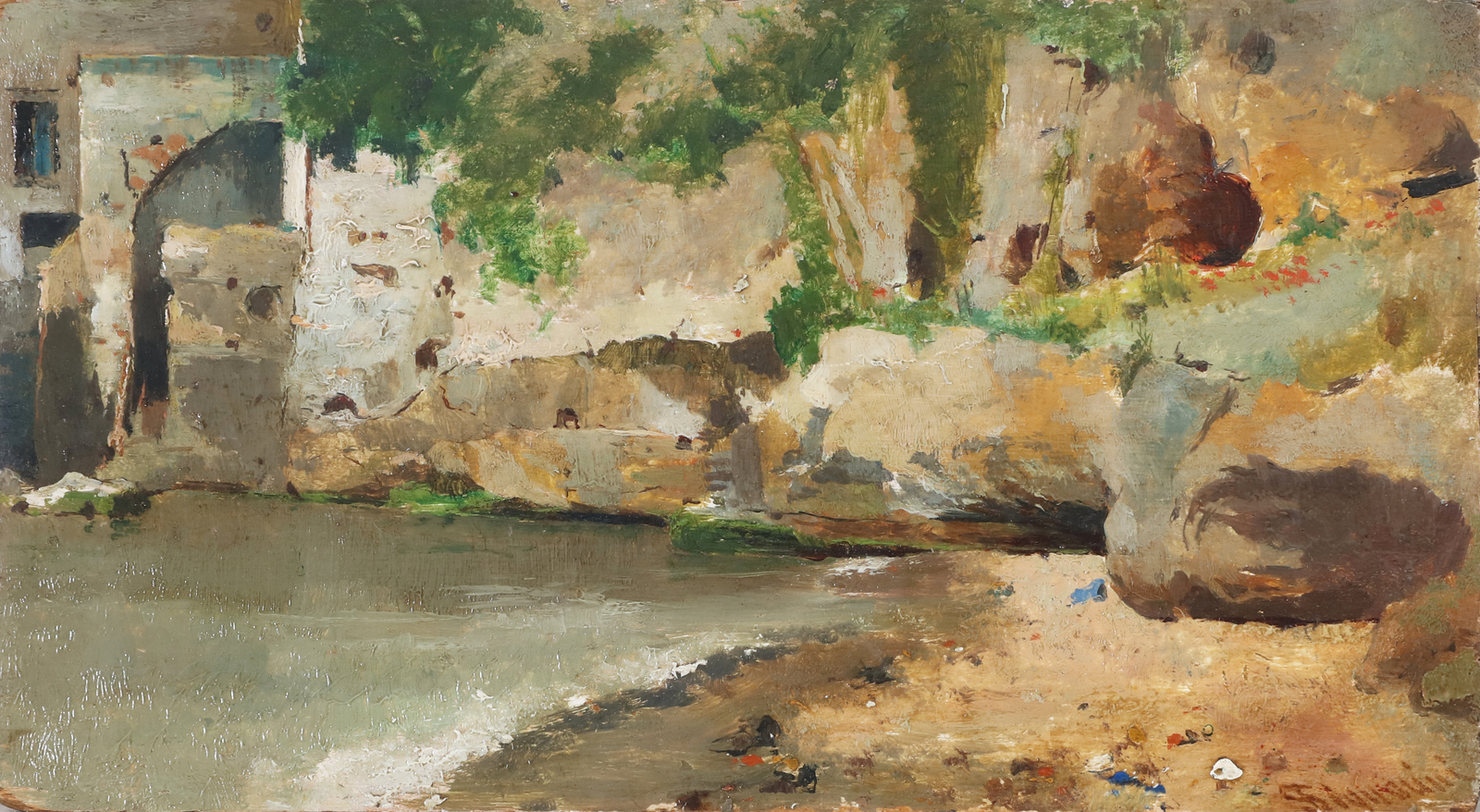 SIGNORINI TELEMACO (1835 - 1901) Rio Maggiore. . Cm 18,00 x 10,00. Firmato in basso a destra.