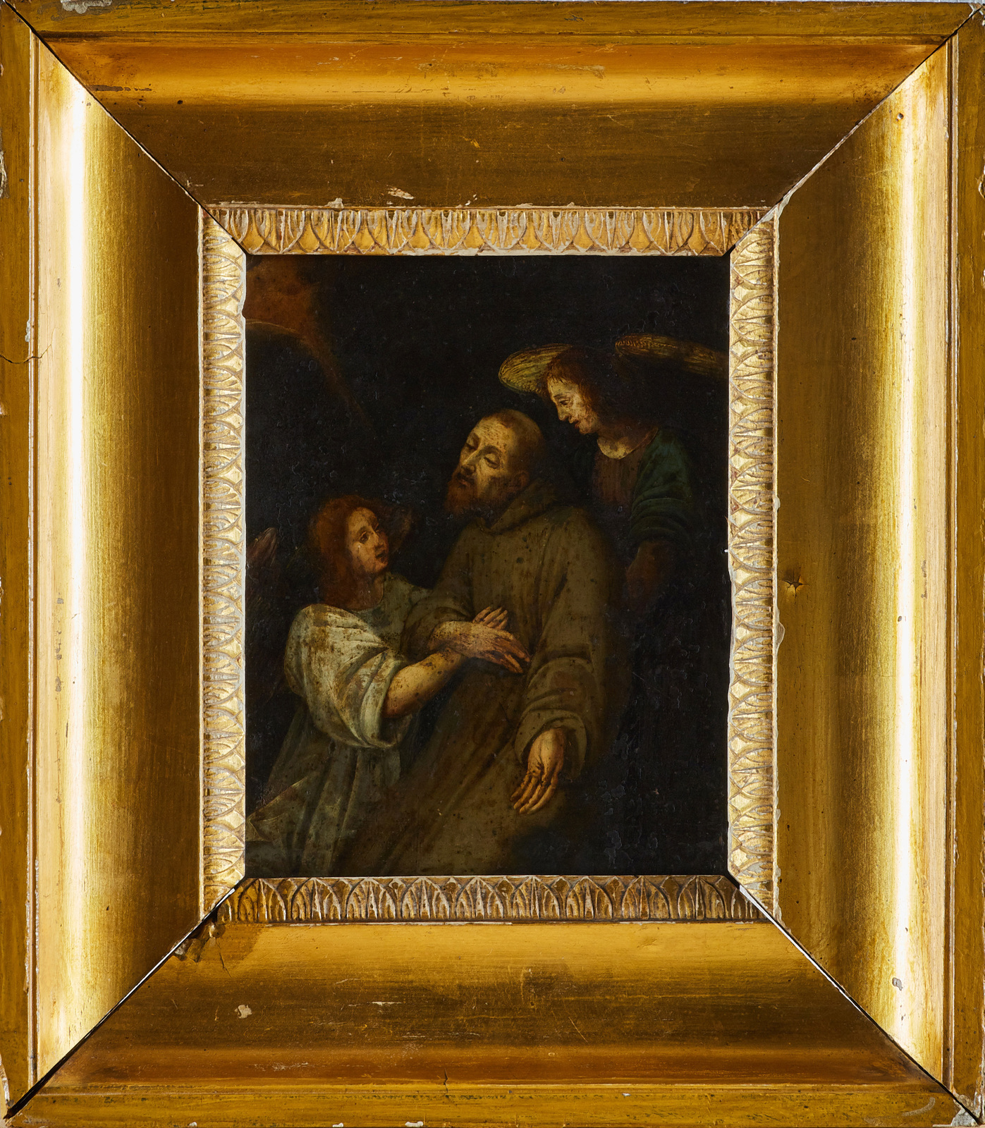 ARTISTA DEL XVIII SECOLO San Antonio da Padova e angeli. Olio su rame. Cm 17,50 x 22,00. . Cornice presente