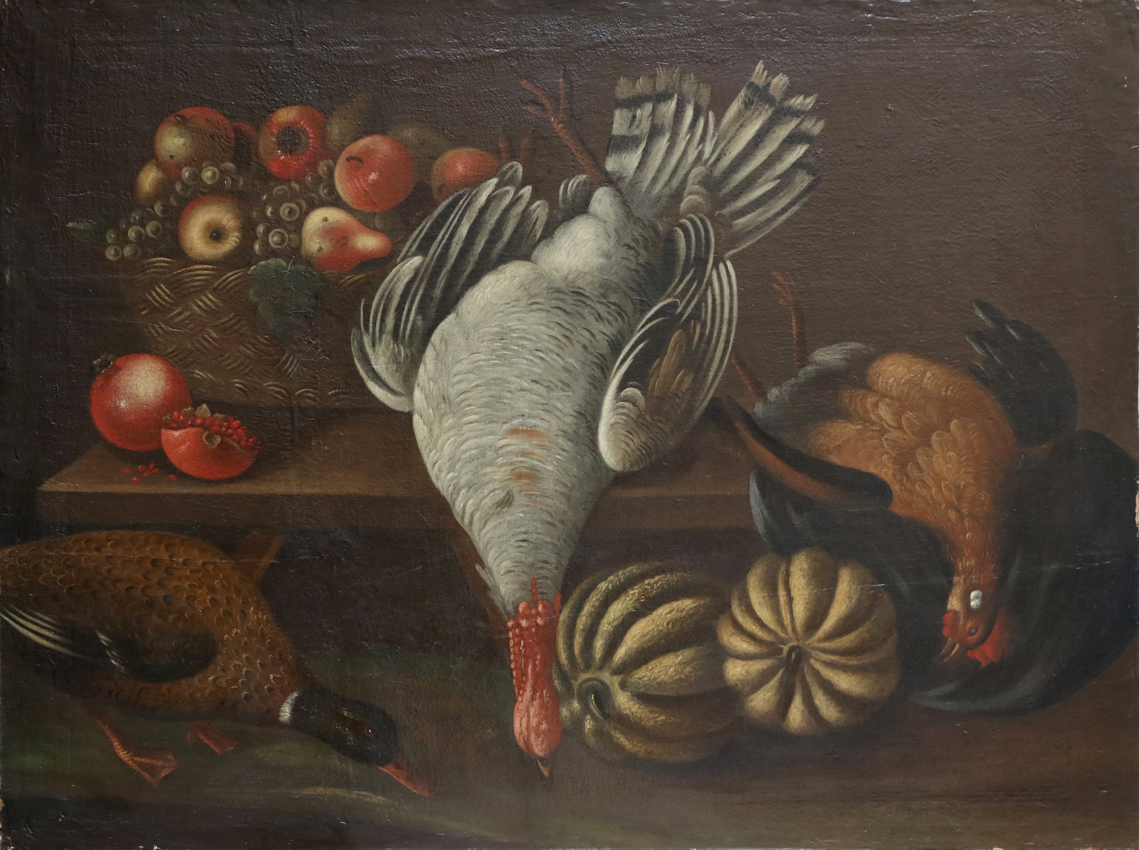 ARTISTA DEL XVII SECOLO. Natura morta con cacciagione. Olio su tela . Cm 86,00 x 116,00.