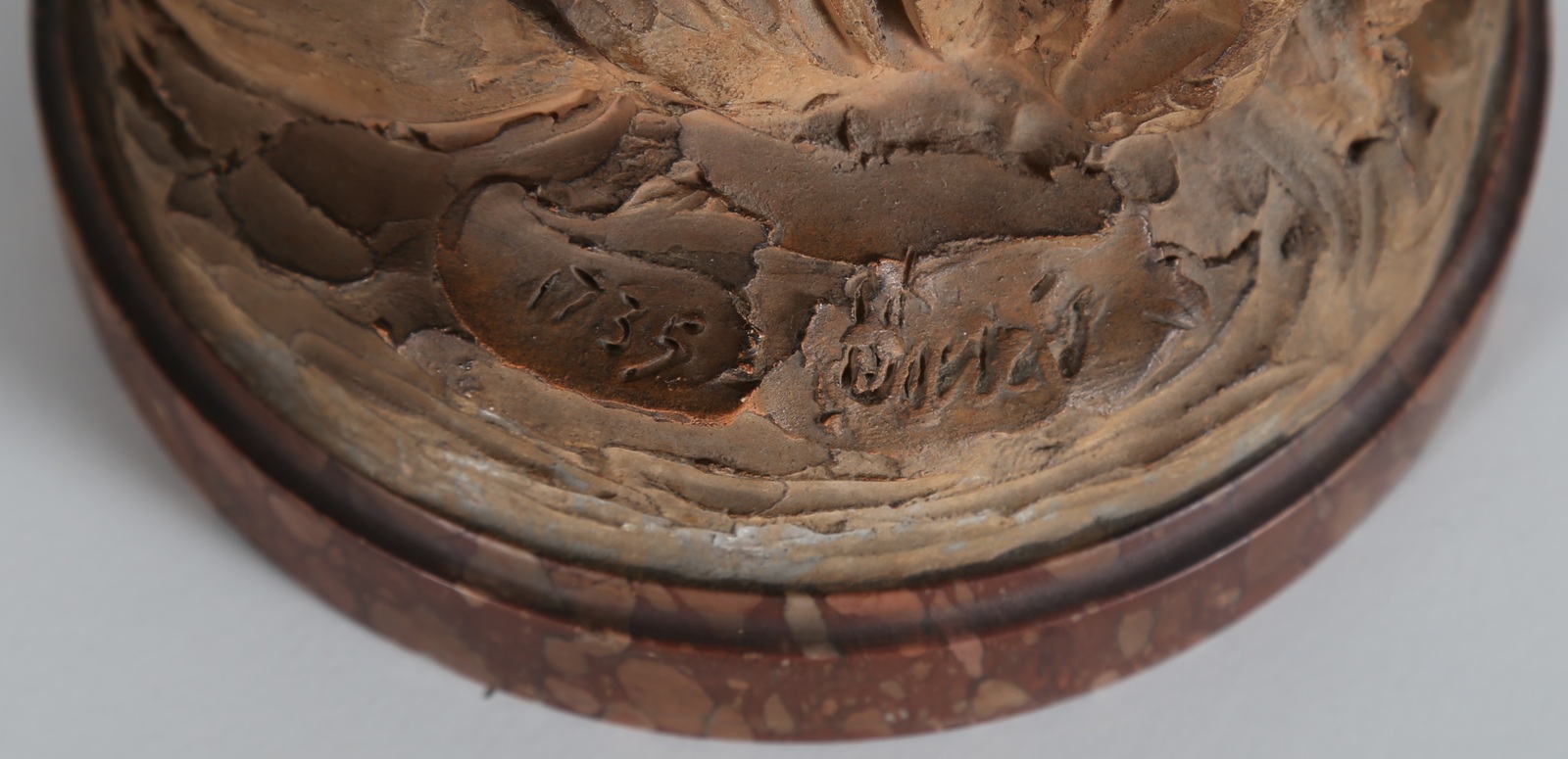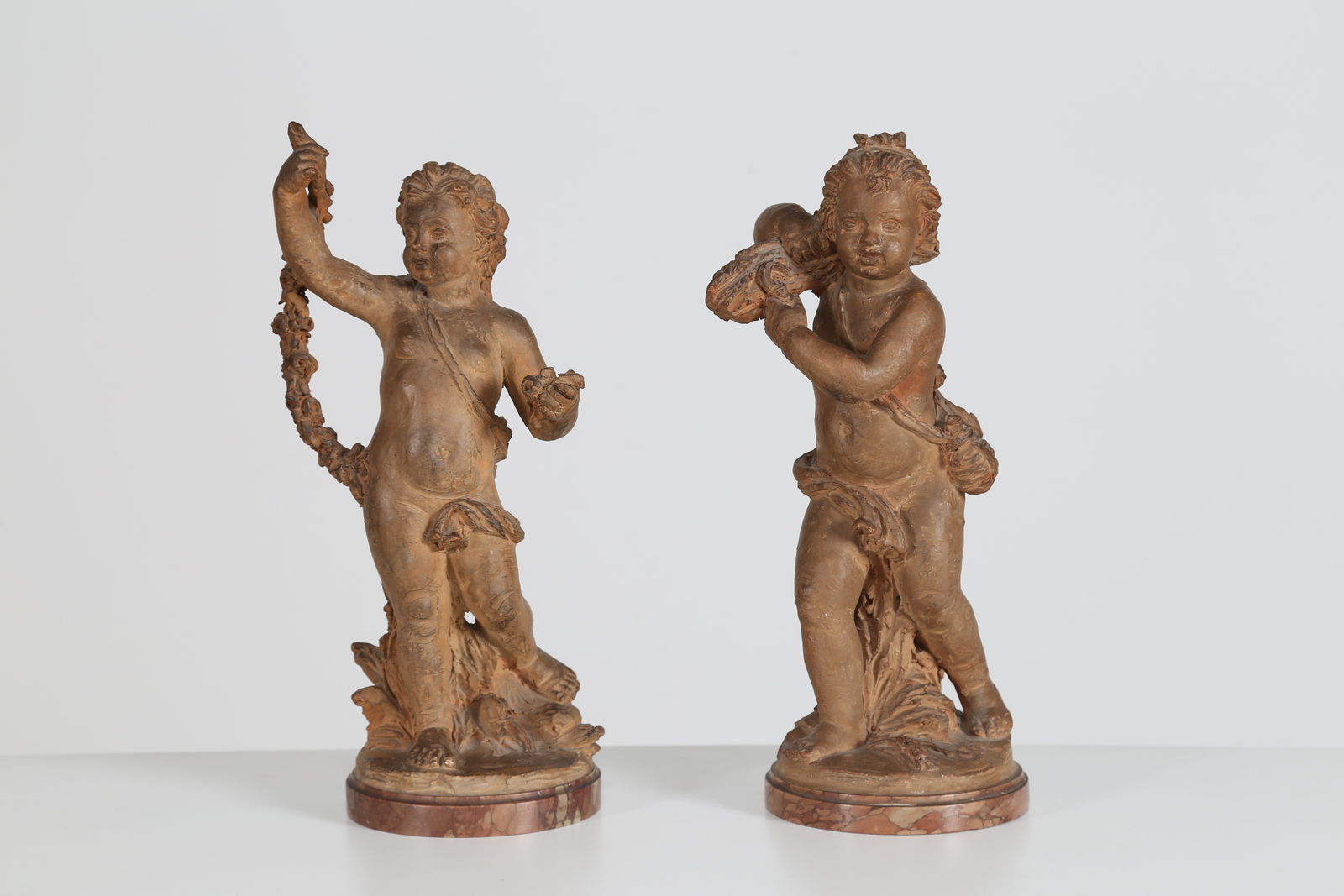 ARTISTA FRANCESE DEL XVIII SECOLO Coppia di putti in terracotta su base in marmo. 1735. . Cm 16,00 x 35,00. Firma illegibile e data alla base.