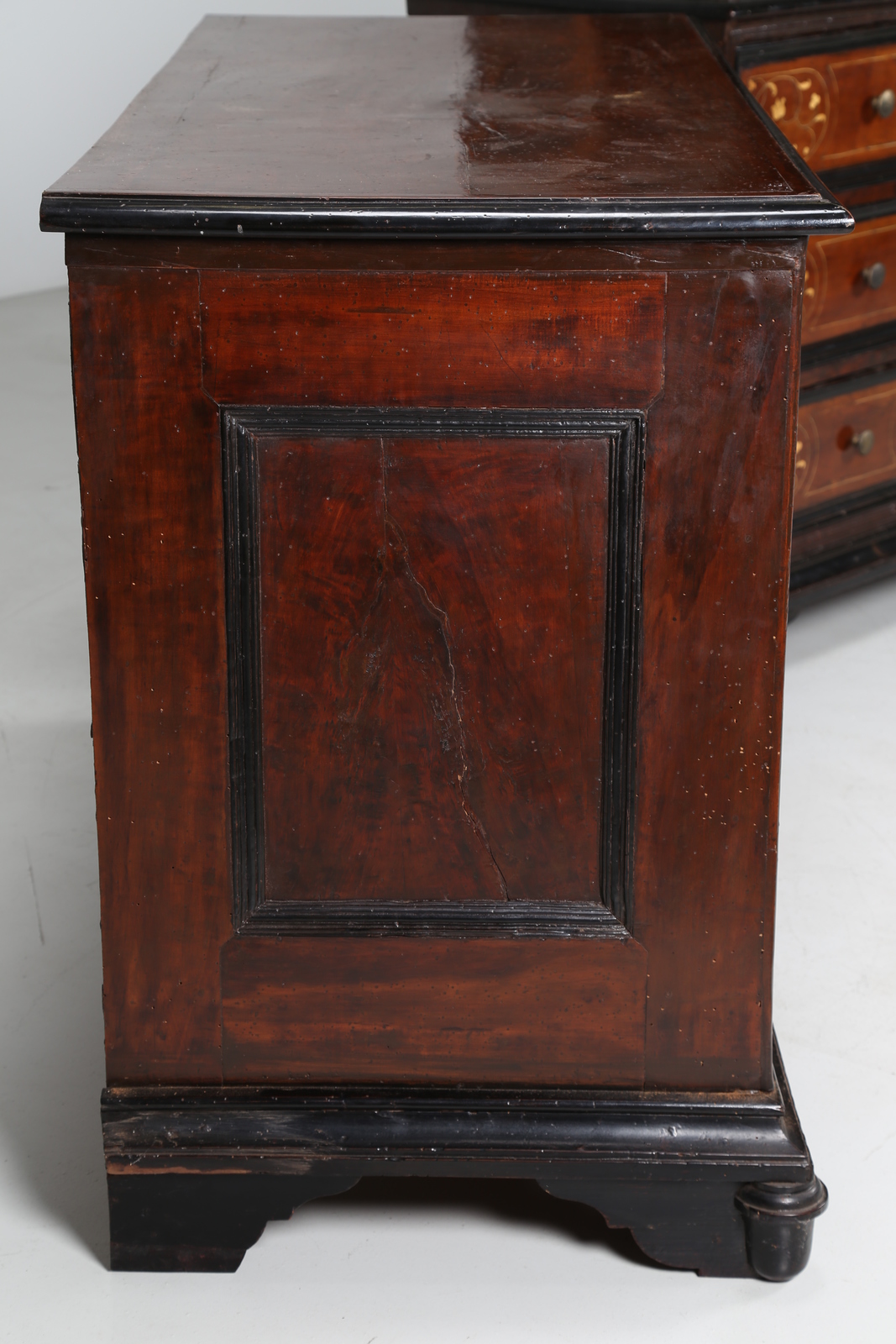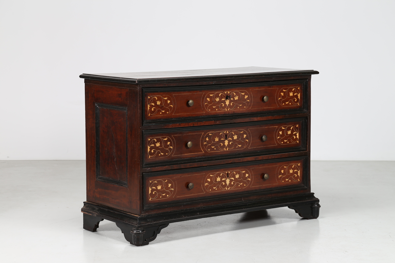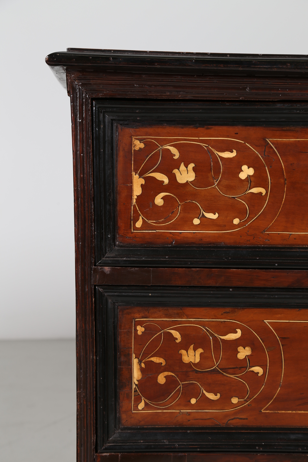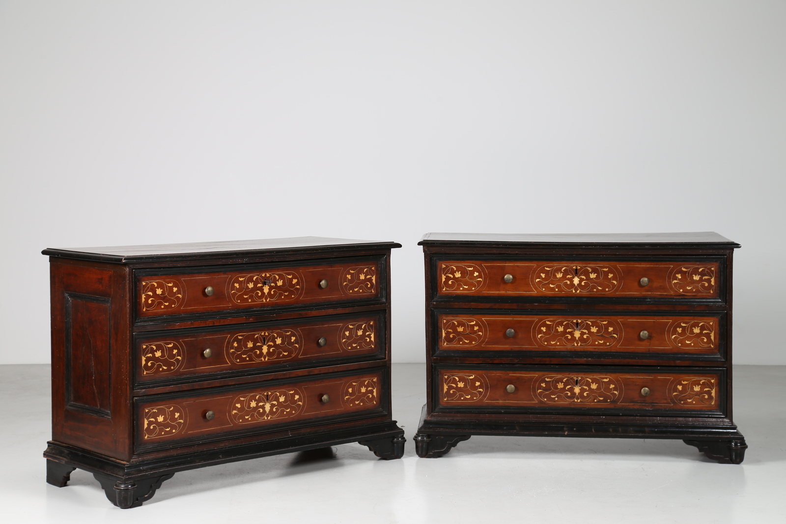 MANIFATTURA LOMBARDA DEL XVII SECOLO Coppia di cassettoni a tre cassetti lastronato in legno di noce intarsiati con elementi floreali in avorio. . Cm 150,00 x 100,00 x 62,50.