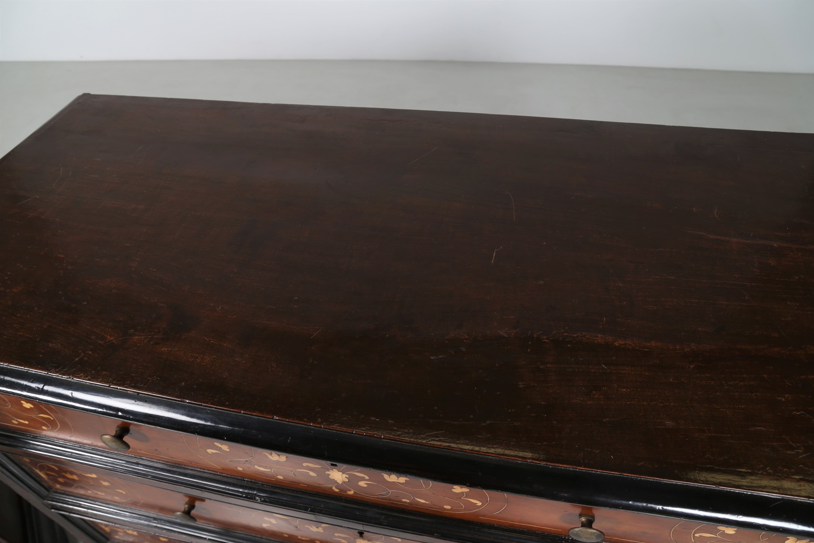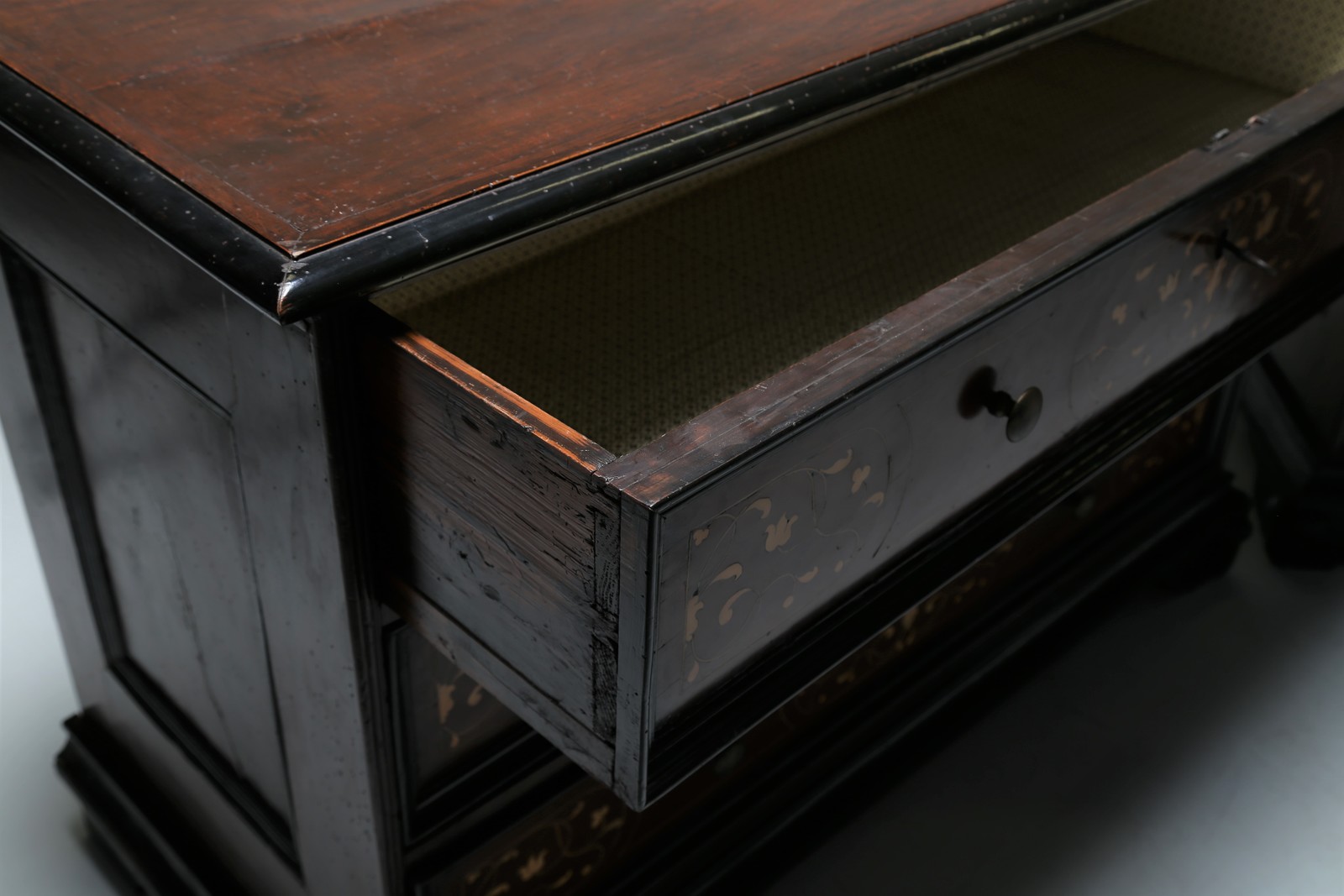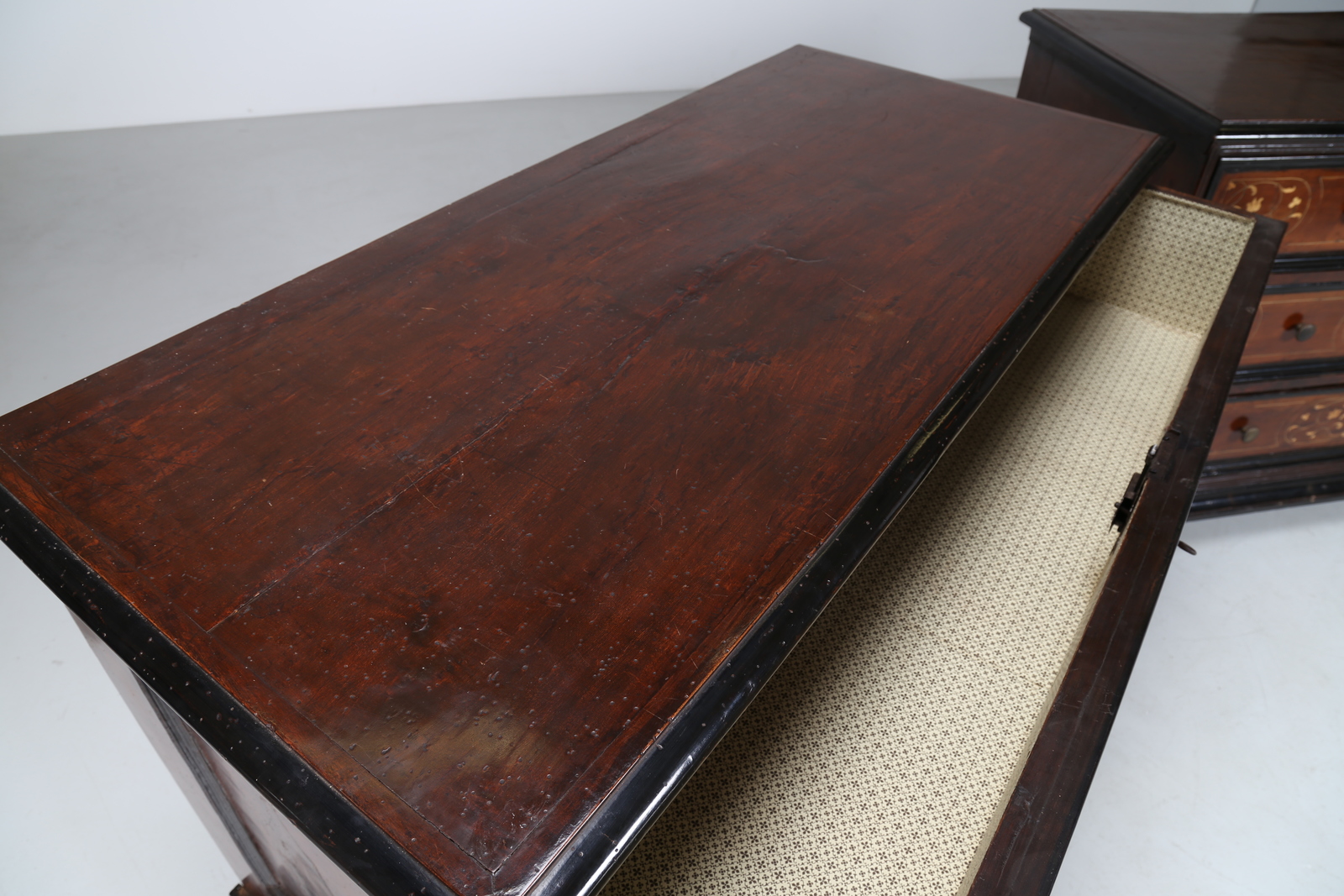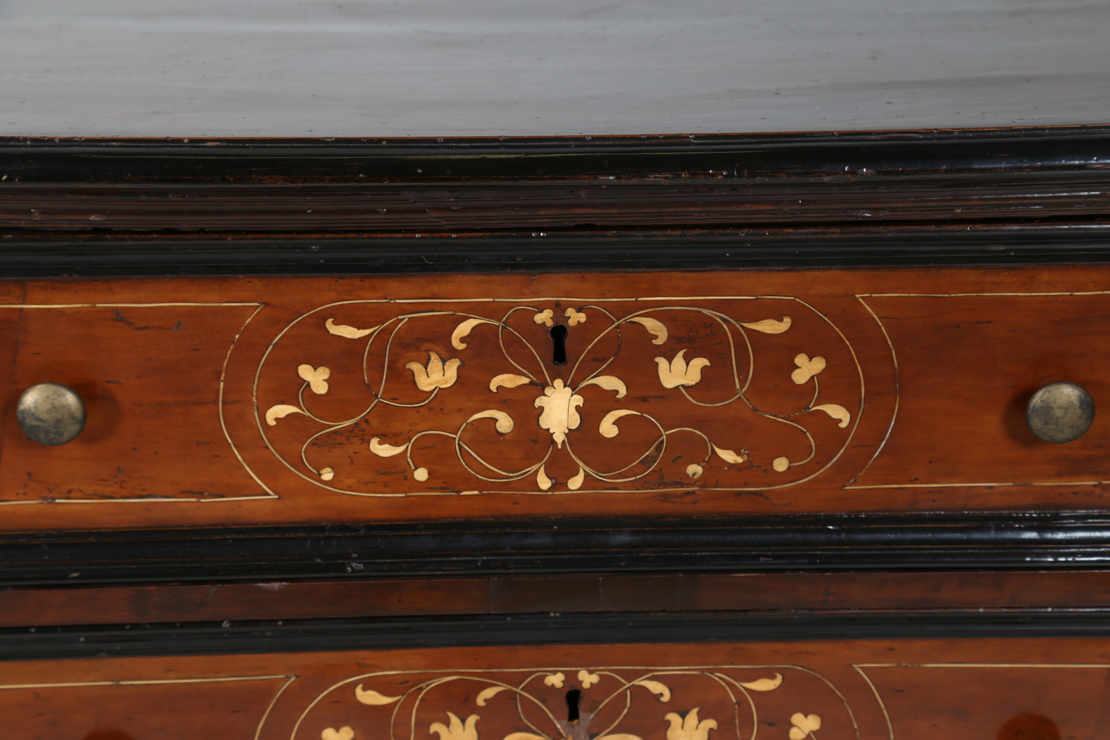 MANIFATTURA LOMBARDA DEL XVII SECOLO Coppia di cassettoni a tre cassetti lastronato in legno di noce intarsiati con elementi floreali in avorio. . Cm 150,00 x 100,00 x 62,50.