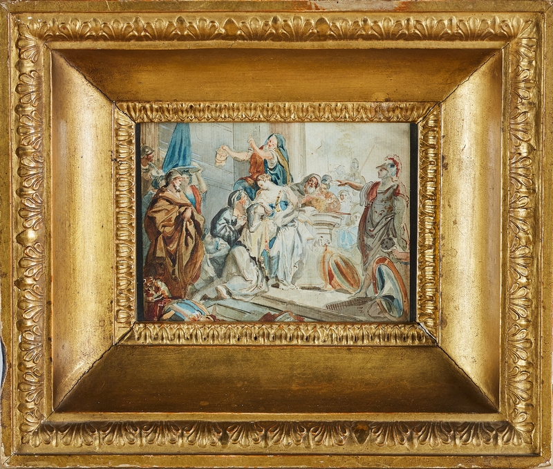 ARTISTA DEL XVIII SECOLO La famiglia di Dario ai piedi di Alessandro. Tecnica mista su carta. Cm 17,00 x 11,50. . Cornice presente
