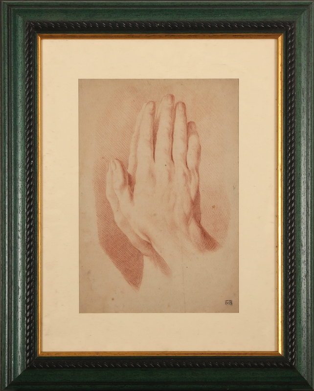 ARTISTA DEL XVIII SECOLO Studio di mani. matita e sanguigna su carta. Cm 22,50 x 32,50. Timbro Collezione Dikeos.