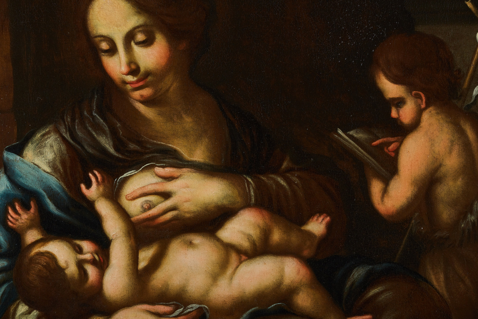 ARTISTA ROMANO DEL XVII SECOLO Madonna con Bambino. Olio su tela . Cm 94,50 x 119,00. In cornice intagliata del XVII secolo. Cornice presente