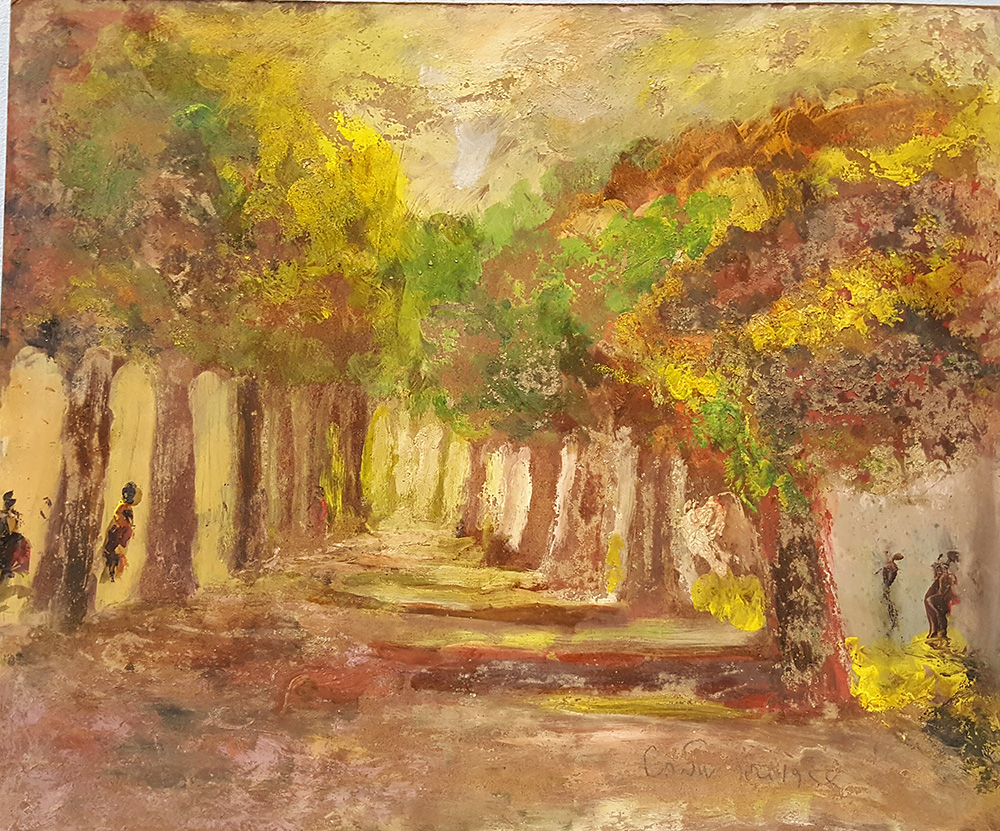 Carlo Pusateri, "Paesaggio alberato", 1958, olio su tavola cm 50x60, firma e anno in basso a destra