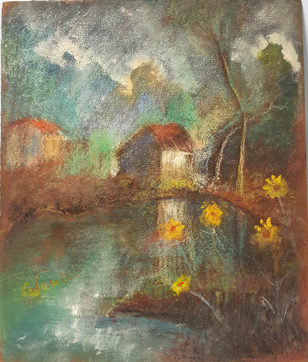 Carlo Pusateri, "Casa vicino al lago", 1957, olio su masonite cm 50x60, firma in basso a sinistra