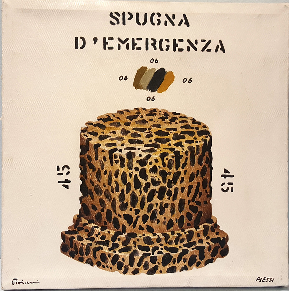 Fabrizio Plessi/Vanni Viviani, 1973, "Mutamento d'emergenza", olio su tela cm 30x30, autentica su foto di Vincenzo Bruno, archivio Vanni/Viviani, timbro al retro, Museo d'Exilles - Bruxelles
