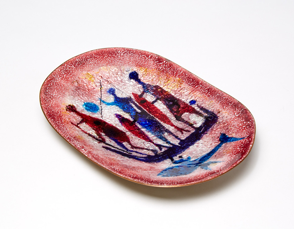 Studio del Campo Svuotatasche in rame smaltato in policromia con scena di pesca. Torino Anni 50. Marcato a incussione "delcampo ITALY" sotto la base (cm 25x17,5) Polychrome enamelled copper vide-poches. Torino 1950s. Stamped "delcampo ITALY" to base (cm 25x17.5)