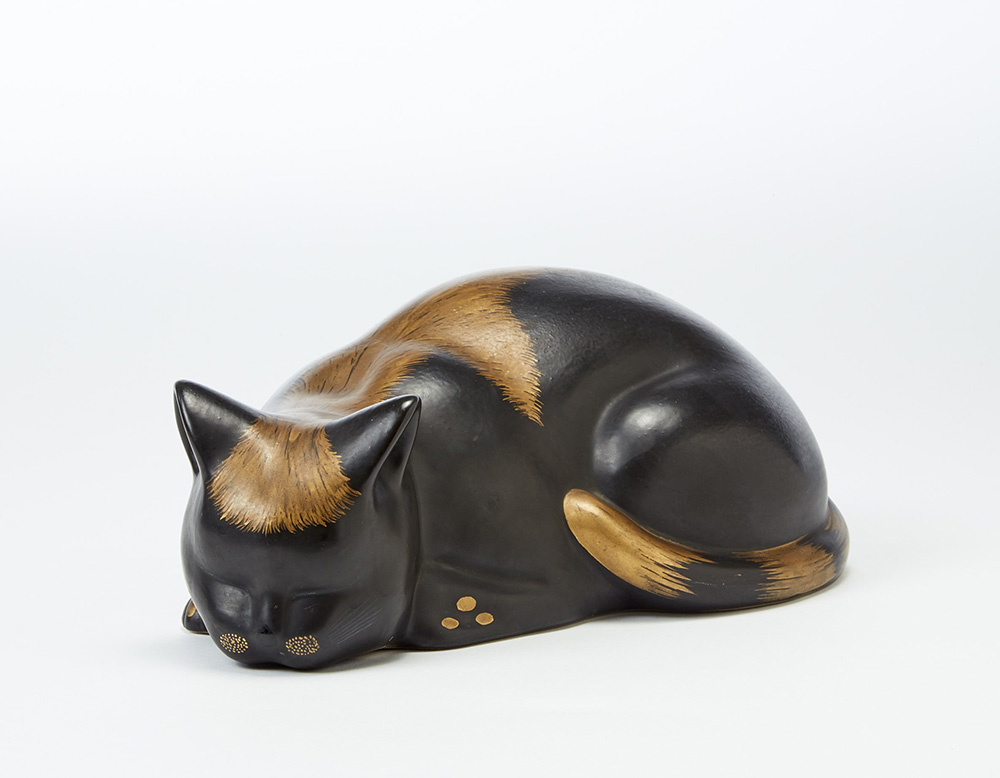 Piero Fornasetti (Milano 1913 - Milano 1988) "Gatto dormiente" Scultura in ceramica formata a colaggio, smaltata in nero e rifinita in oro. Milano, anni 60. Marcata in nero entro il simbolo grafico del sole "FORNASETTI - MILANO MADE IN ITALY" (l cm 30) (difetti)