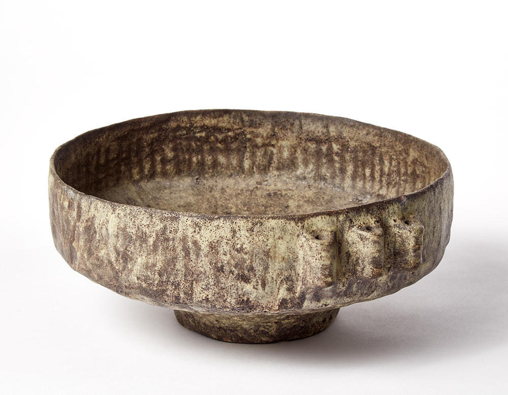 Marcello Fantoni (Firenze 1915 - Firenze 2011) Vaso in ceramica di forma circolare irregolare con tre piccole anse su un lato, smaltato a colature opache nei toni del bruno e del verde. Anni 50. Firmato "Fantoni Italy" sotto la base (d cm 27, h cm 12) (lievi difetti) Irregular round ceramic vase with enmelled opaque drippings in the hues of brown and green, 1950s. Signed "Fantoni Italy" to base (d cm 27, h cm 12) (minor defects)