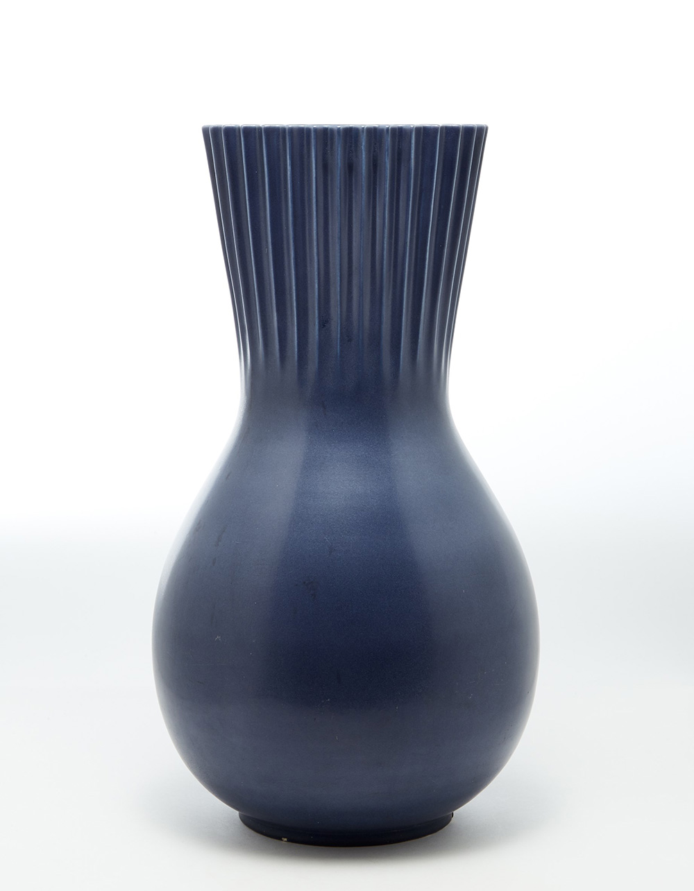 Giovanni Gariboldi (1908 - Milano 1971) Grande vaso modello "6599". Manifattura Richard-Ginori , San Cristoforo, Milano, anni 30. Terraglia modellata a colaggio, corpo bulbiforme con collo scalettato a soffietto, smaltato in blu carta da zucchero. Marcato sotto la base con monogramma in verde, numerale 6599 incusso, numerale 7597 in nero (h cm 61,5) (difetti) Bibliografia: Società Ceramica Richard-Ginori Milano, Ceramiche d'arte della manifattura di S Cristoforo, Catalogo n. 104, Gennaio 1938, tav. 48
