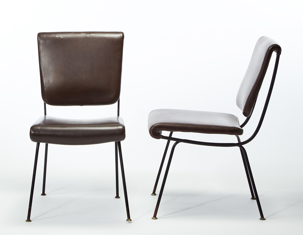 Gastone Rinaldi (Padova 1920 - Padova 2006) Coppia di sedie modello "DU24". Produzione Rima, Padova, 1956. Tondino d'acciaio verniciato nero, rivestimento in similpelle marrone (cm 44x84x55) (difetti) Bibliografia: G. Drago, J. Drago, Gastone Rinaldi designer alla Rima, Edizioni Capitolium Art, Brescia, 2015, p. 187