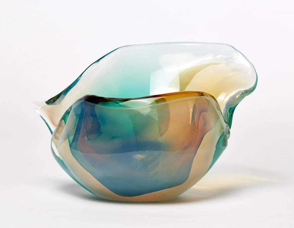 Archimede Seguso (Murano 1909 - Murano 1999) "Conchiglia" Coppa a forma di conchiglia in vetro sommerso incolore, azzurro, verde acqua, ambrato e lattescente. Murano, anni 50 (l cm 28, h cm 17,5) Bibliografia: I vetri di Archimede Seguso, a cura di U. Franzoi, Arsenale, Venezia 1991, p. 99 "Conchiglia" Multicoloured sommerso glass shell shpaed bowl. Murano, 1950s (l cm 28, h cm 17.5) Bibliography: I vetri di Archimede Seguso, a cura di U. Franzoi, Arsenale, Venezia 1991, p. 99