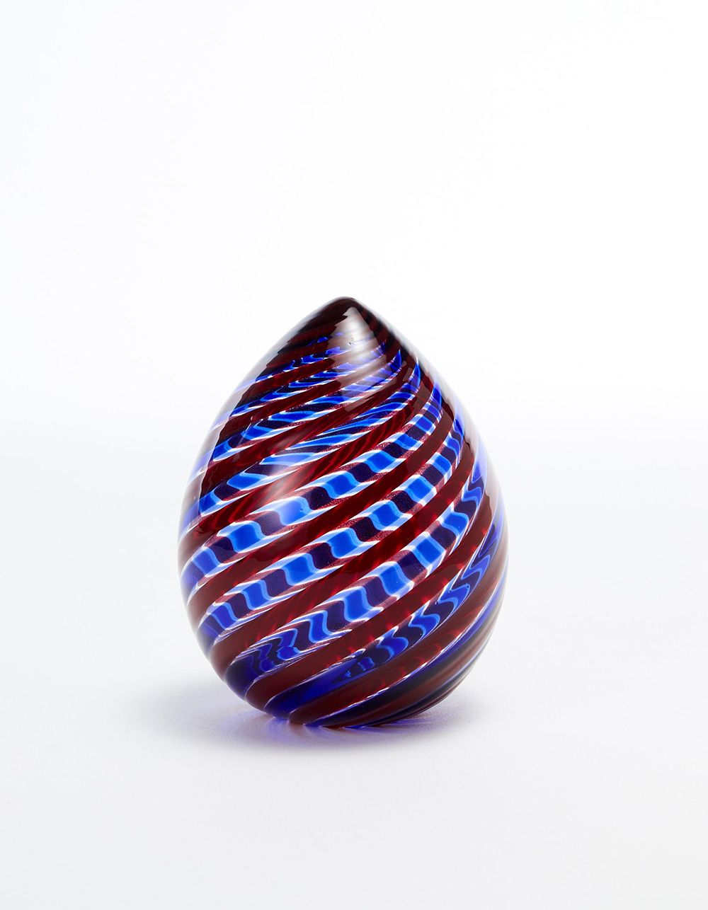 Venini Uovo in vetro soffiato a canne ritorte a fasce rosse, blu e incolore, Murano 1980. Firmato a punta sotto la base "venini italia 80" (d cm 9, h cm 12)