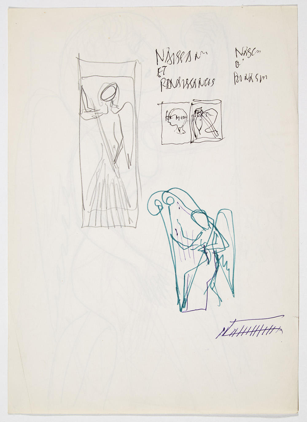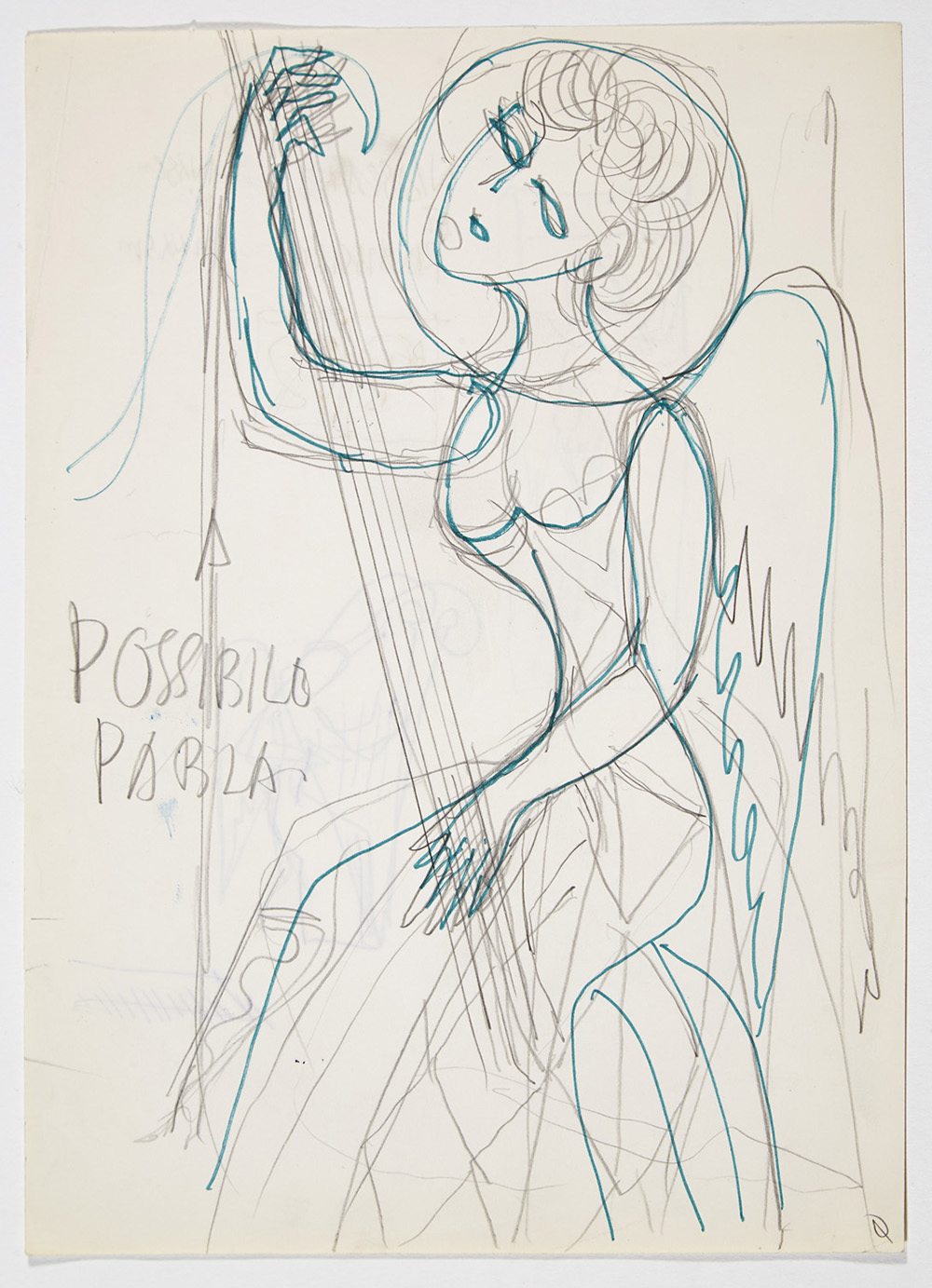 Gio Ponti (Milano 1891 - Milano 1979) "Angelo - donna musicante" Disegno di un angelo musicante al recto, schizzi per angeli musicanti e iscrizione "NAISSANCE ET RENAISSANCE - NASCITA E RINASCITA" al verso, Milano, anni 70. Grafite, pennarello verde e inchiostro nero su casta formato A4 (cm 21x29,5) Provenienza: collezione privata, Milano "Angelo - donna musicante" Drawing of a musician angel to front, sketches for musician angels and inscribed NAISSANCE ET RENAISSANCE - NASCITA E RINASCITA" to reverse. Milan, 1970s. Graphite, green felt pen and black ink on papaer (cm 21x29.5) Provenance: private collection, Milano