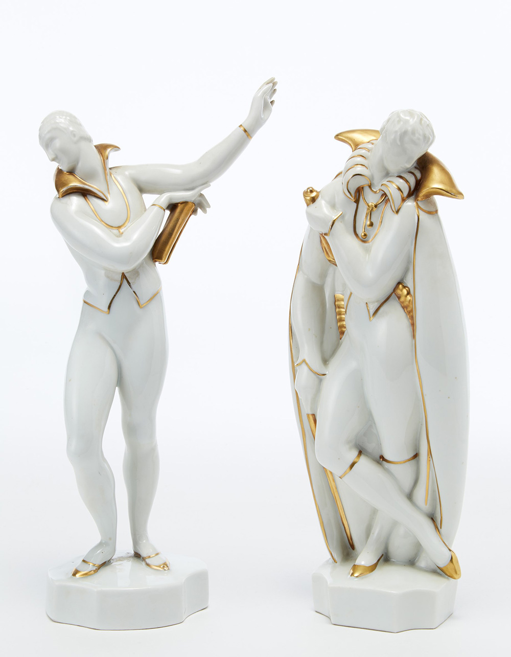 Gio Ponti (Milano 1891 - Milano 1979) "Il Poeta" e il "Maestro di Danze" due sculture in porcellana formata a colaggio, smaltata in bianco sotto vetrina e lumeggiata a mano in oro. Manifattura Richard-Ginori, Pittoria di Doccia, 1927-1927 ca. Recanti sotto la base in verde il marchio della manifattura e i numerali 30-3 (Il Poeta) e 30-10 (Il Maestro di Danze). Esemplari simili, con lievi differenze nel decoro in oro, sono registrati presso il Museo Richard-Ginori di Doccia, cat. 107, inv. 3078 (Il Poeta), cat. 104, inv. 3079 (Il Maestro di Danze). (h cm 28, h cm 29) (lievi difetti e restauri) Bibliografia: Gio Ponti alla manifattura di Doccia, a cura di A. Pansera e P. Portoghesi, SugarCo Edizioni, Milano 1982, pp. 42-43; Gio Ponti. Le maioliche, a cura di L. Manna, Biblioteca di via San Senato, 2000, p. 102; Gio Ponti. Il fascino della ceramica, a cura di D. Matteoni, Silvana Editoriale, Cinisello Balsamo 2011, p. 90; Gio Ponti. La collezione del Museo Richard-Ginori della Manifattura di Doccia, a cura di L. Frescobaldi Malechini, M. T. Giovannini, O. Rucellai, Maretti, Firenze 2015, pp. 185, 186-187