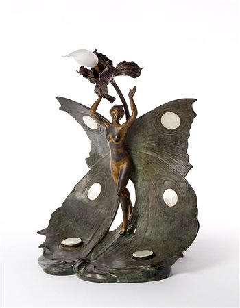 Jules Jouant (Parigi 1863 - 1921) Lampada da tavolo simbolista in fusione di bronzo, raffigurante una figura femminile alata emergente da uno stagno a braccia levate, reggenti un fiore. Tondi in madreperla incastonati nelle ali, sulla base due calamai con coperchi in madreperla. Francia, 1890-1900. Firmata "Jouant" sulla base (h cm 45) (lievi difetti) Accompagnato da dichiarazione della Galleria Balzaretti di Milano Bibliografia: A. Duncan, Art Nouveau Sculpture, Rizzoli, Milano 1978, p. 37; P. KjellbergLes bronzes du XIX siècle. Dictionnaire des sculptures, Les éditions de l'amateur, Paris 1987, p. 393 Bronze cast table lamp representing a winged female figure, mother-of-pearl details. France 1890-1900. Signed "Jouant" to base. (h cm 45) (minor defects) Appended declaration by the Galleria Balzaretti di Milano Bibliography: A. Duncan, Art Nouveau Sculpture, Rizzoli, Milano 1978, p. 37; P. KjellbergLes bronzes du XIX siècle. Dictionnaire des sculptures, Les éditions de l'amateur, Paris 1987, p. 393