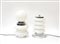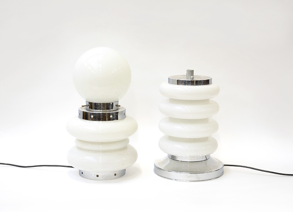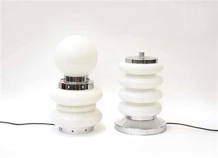 Lotto composto da due lampade a totem in vetro incamiciato lattimo e metallo cromato. Produzione italiana, anni 50 (hmax cm 45)