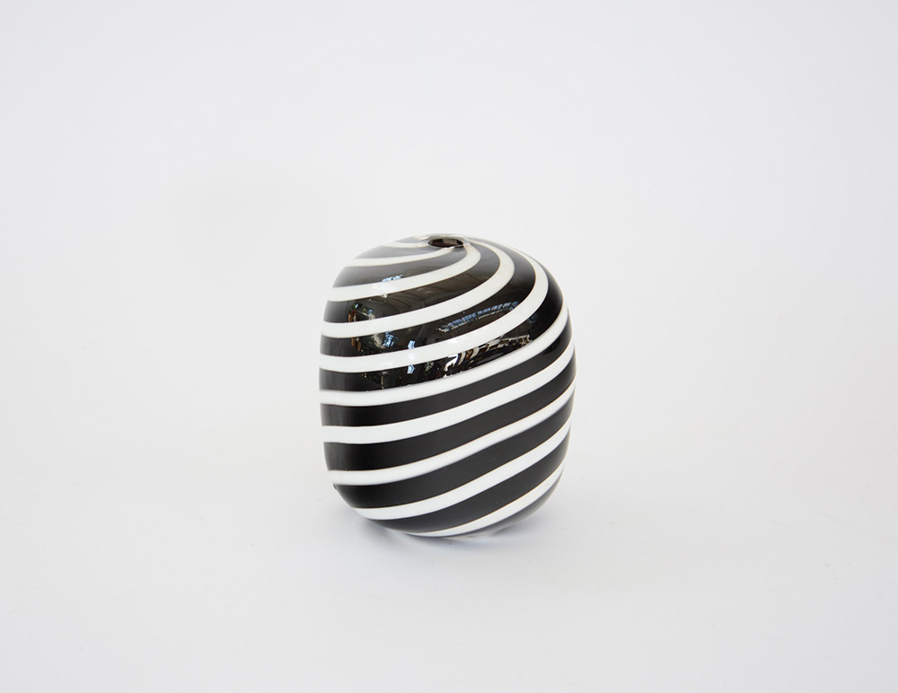 Manifattura di Murano. Vasetto in vetro soffiato da fasce ritorte ametista scuro e lattimo. Anni 60-70 (h cm 13) (lievi difetti)