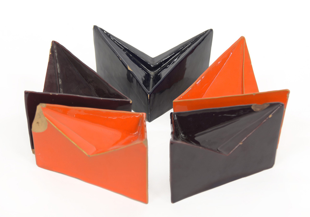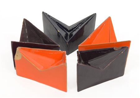 Alfredo Pizzo Greco (Palermo 1942 - Susio 2013) Cinque sculture a base triagolare in ceramica blu, melanzana e arancio. Probabile produzione Gabbianelli, Italia anni 70 (difetti)