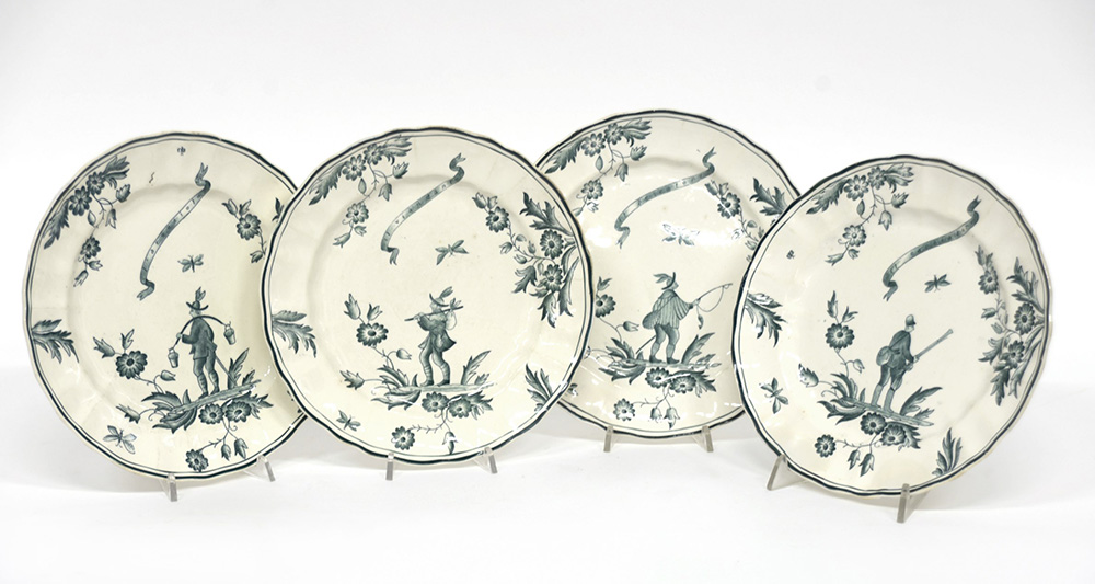 Gio Ponti (Milano 1891 - Milano 1979) Quattro piatti della serie "Ermione" in terraglia deocrata in verde su fondo crème. Manifattura Richard Ginori, Milano, anni 30 (d cm 25)