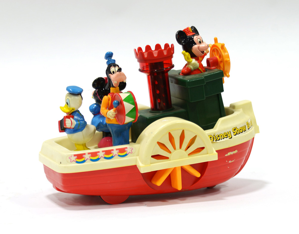 Disney Show Boat. Giocattolo in plastica con meccanismo semovente e personaggi d'animazione Disney. Licenza Disney, fabbricato in Hong Kong 1981 (cm 30x23) (lievi difetti)