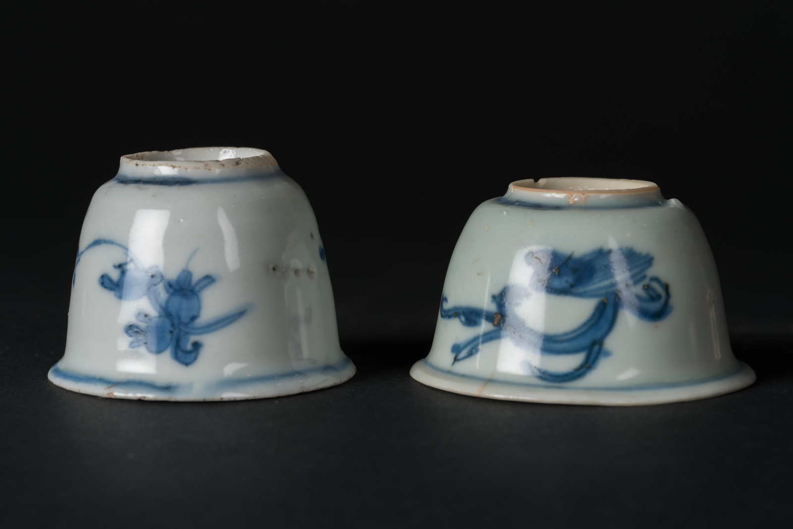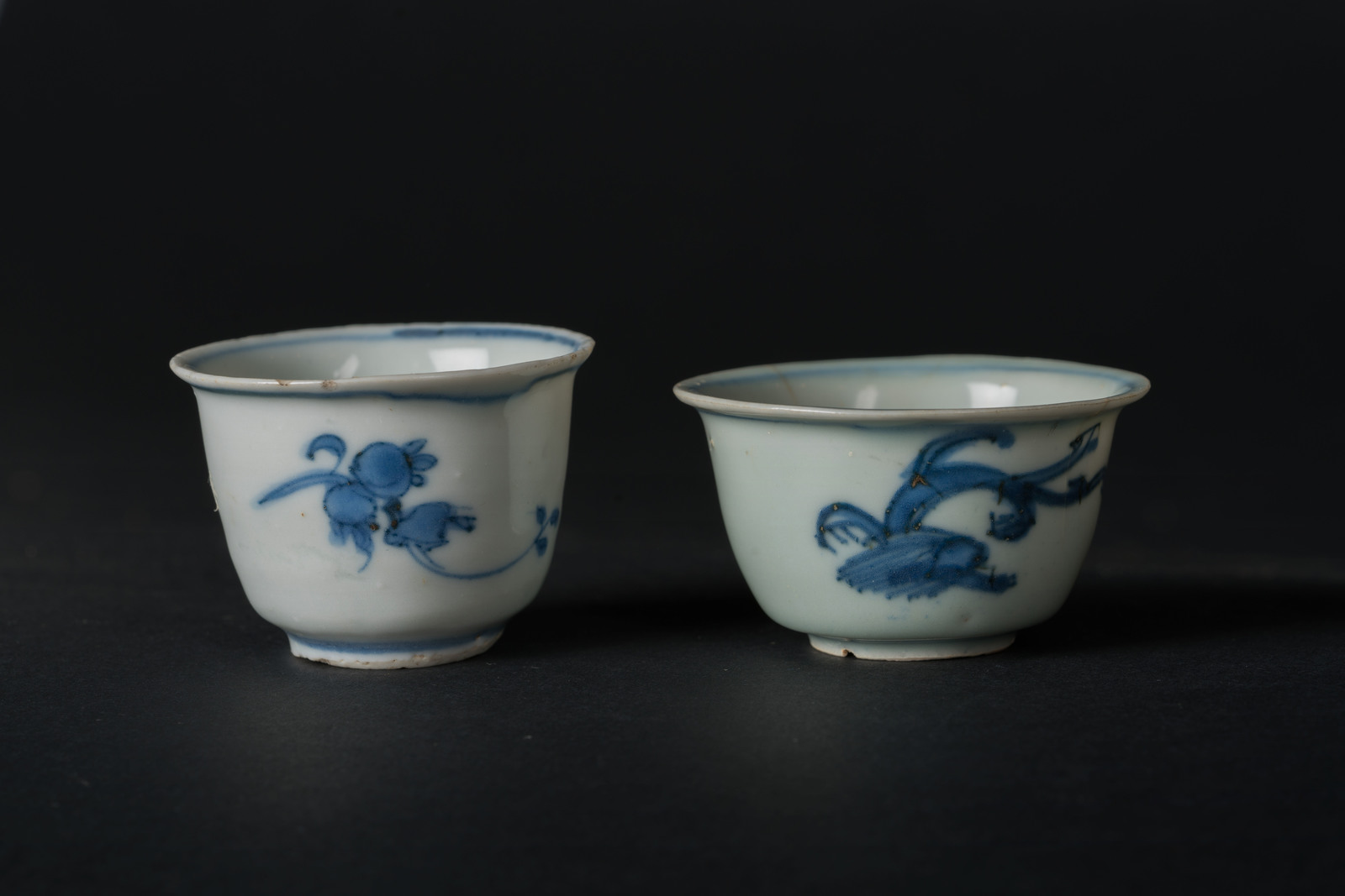 Arte Cinese Lotto di due tazzine in porcellana bianco/blu dipinte con motivi floreali