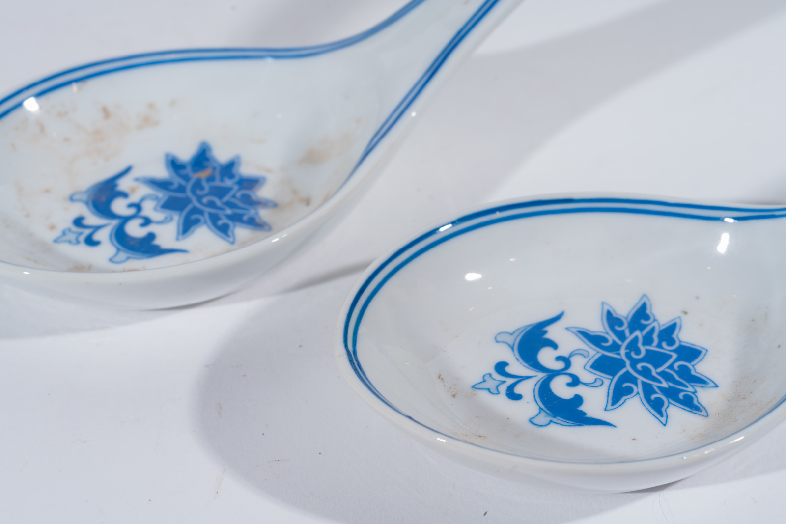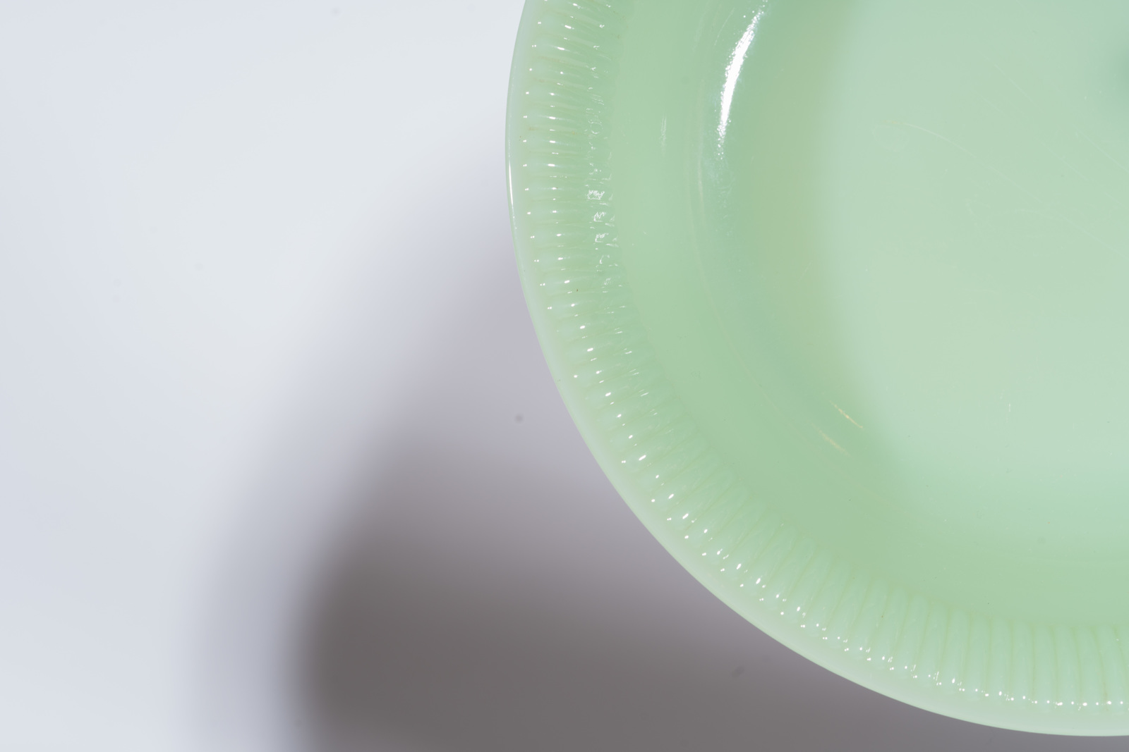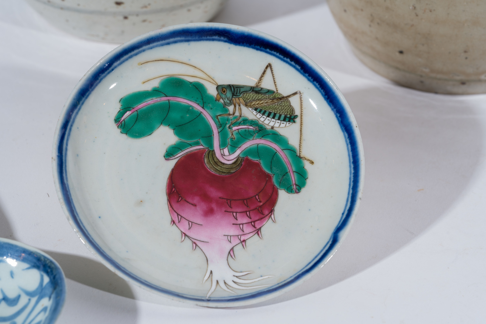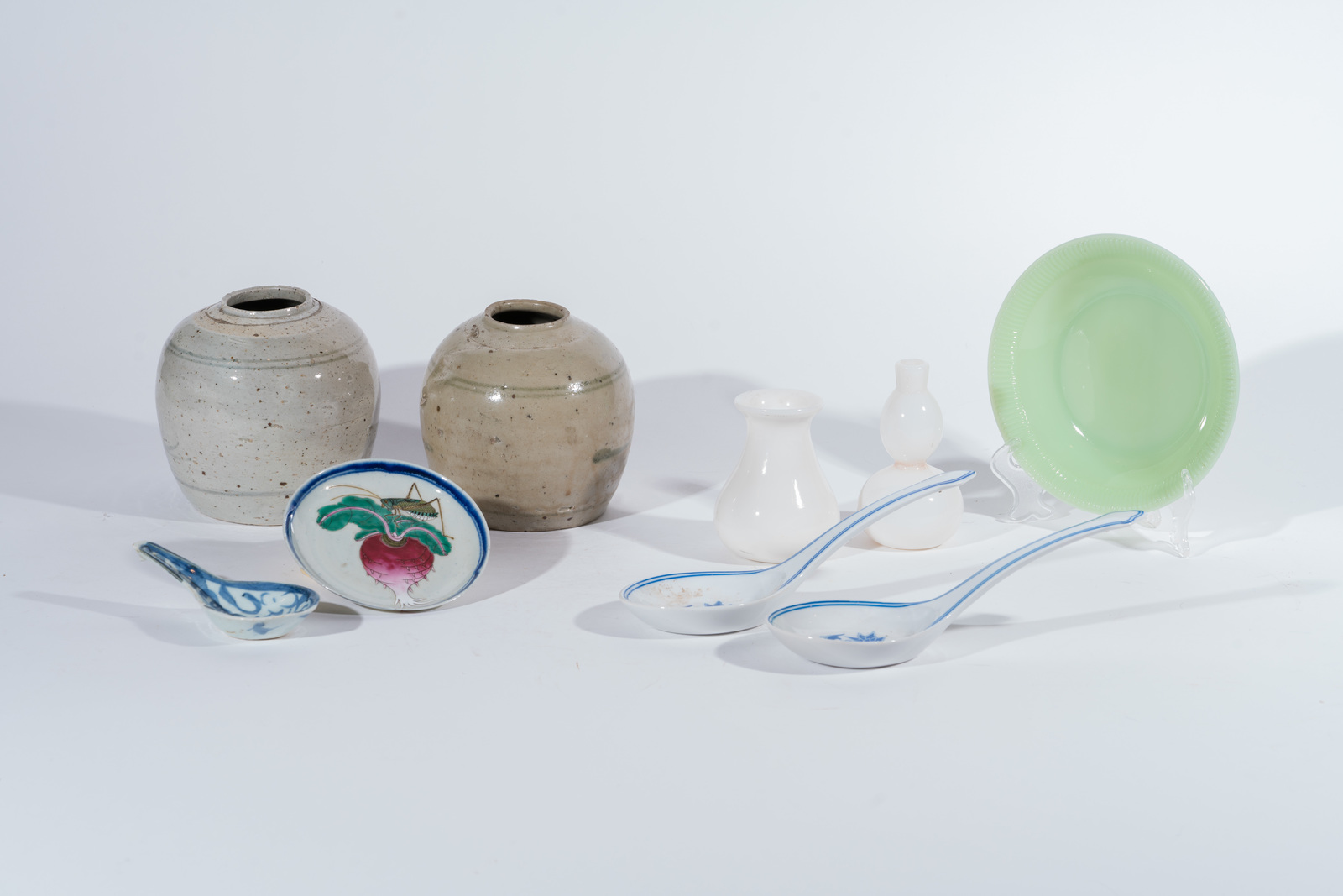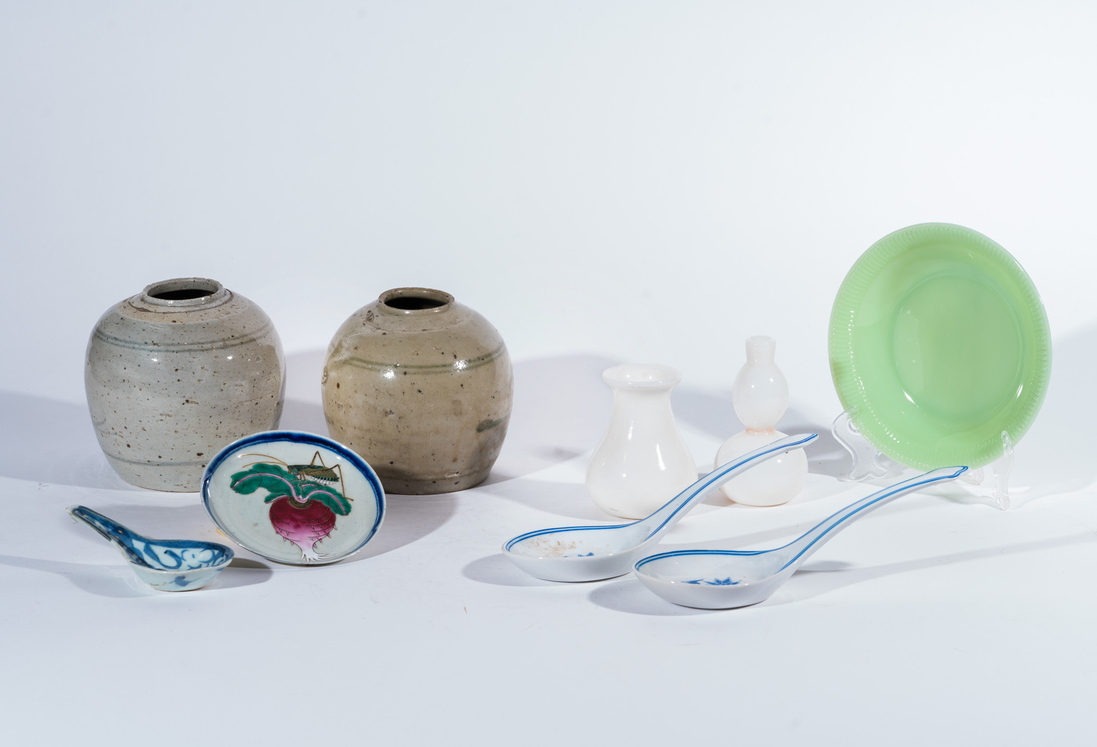 . -. Cm 19,00. Un piatto in giada (diam. 19 cm); tre mestoli in porcellana bianco blu (il più grande l. 25 cm); due vasetti in vetro opalino ( il più alto 13 cm); piattino in ceramica smaltato con cicala (diam. 13,5); due vasi popolari in ceramica (h. 14,5 cm).