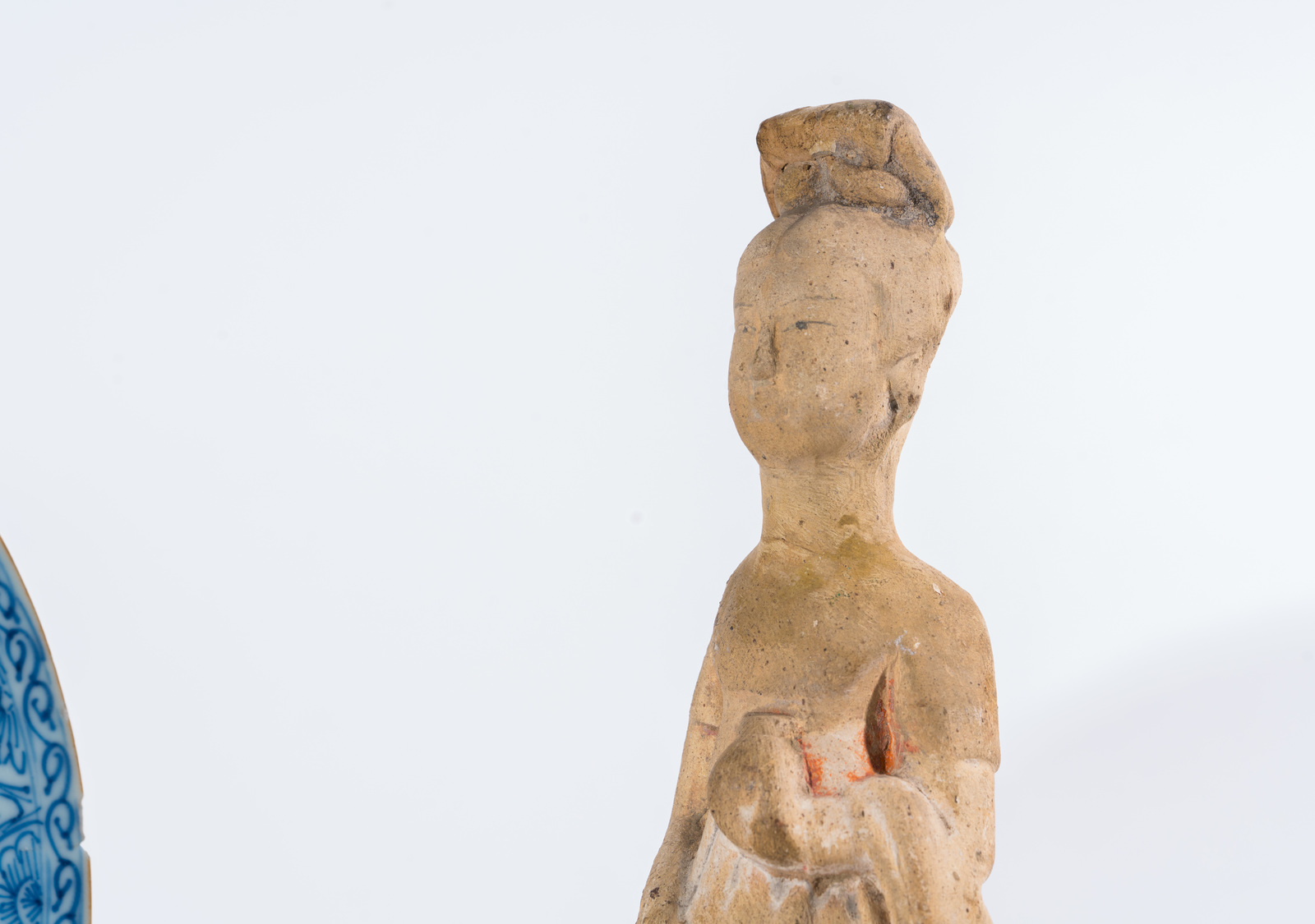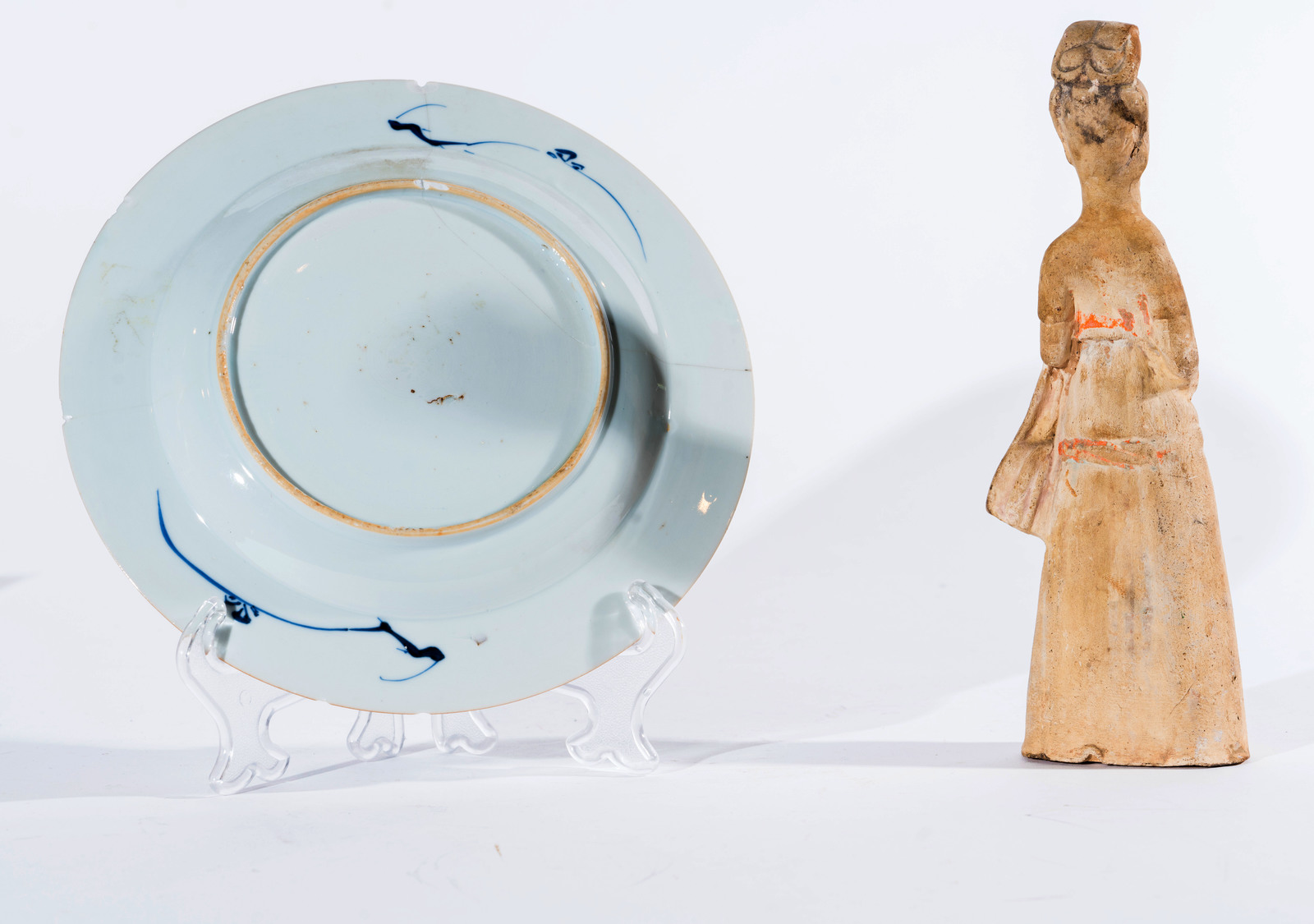 Chinese Art A porcelain blue and white dish and a Tang earthenware lady figure