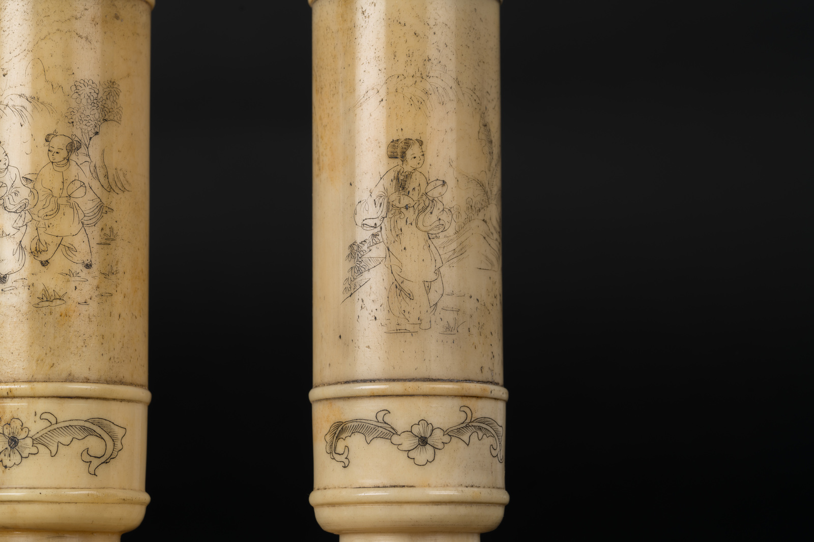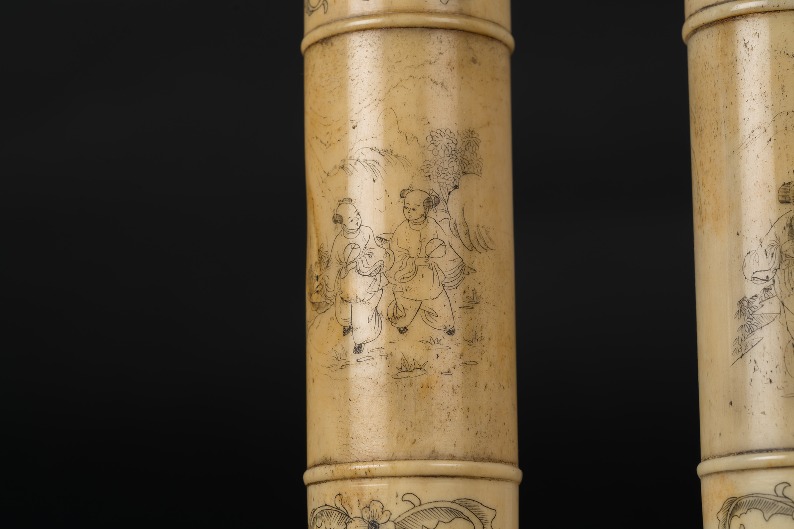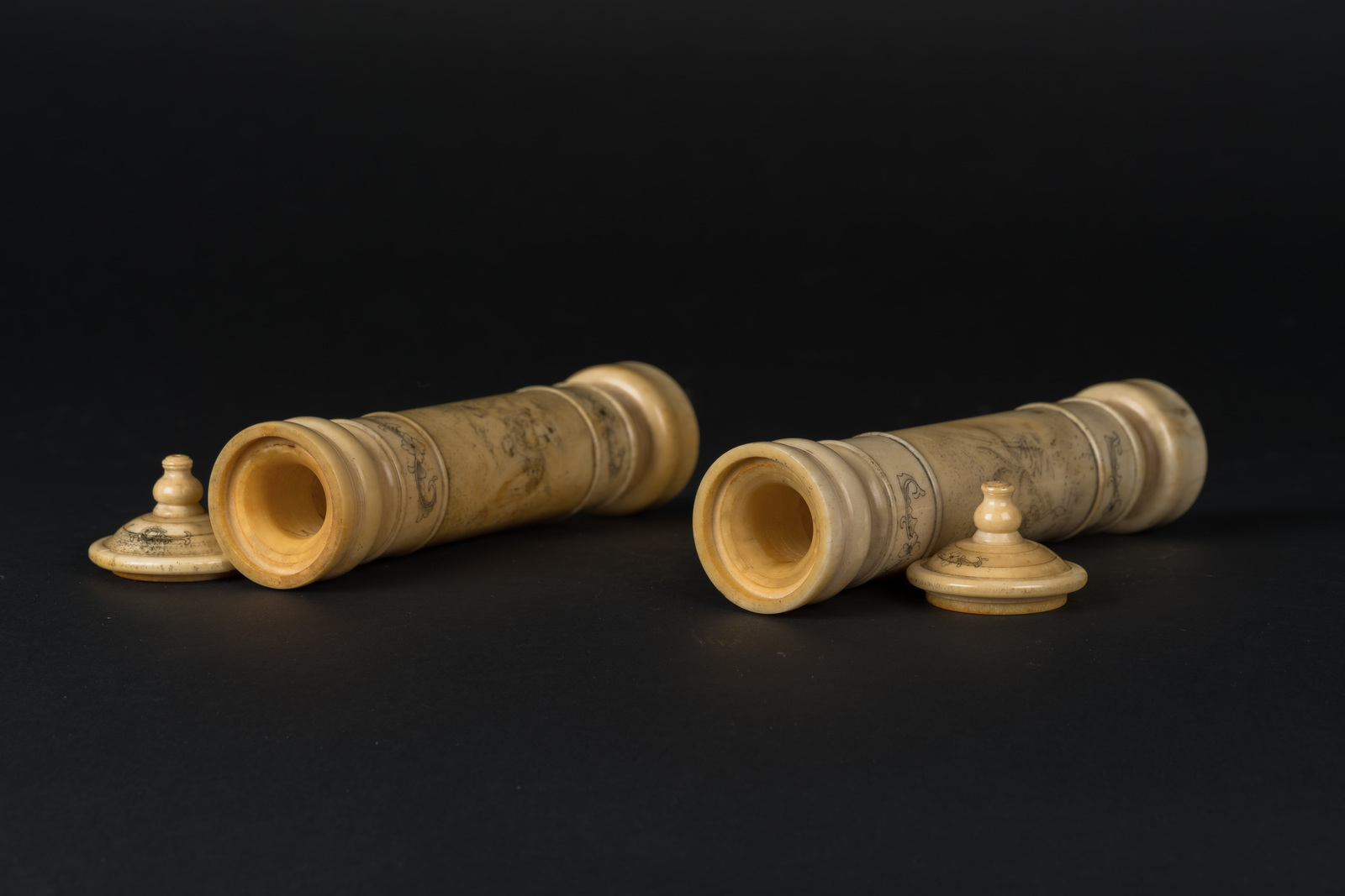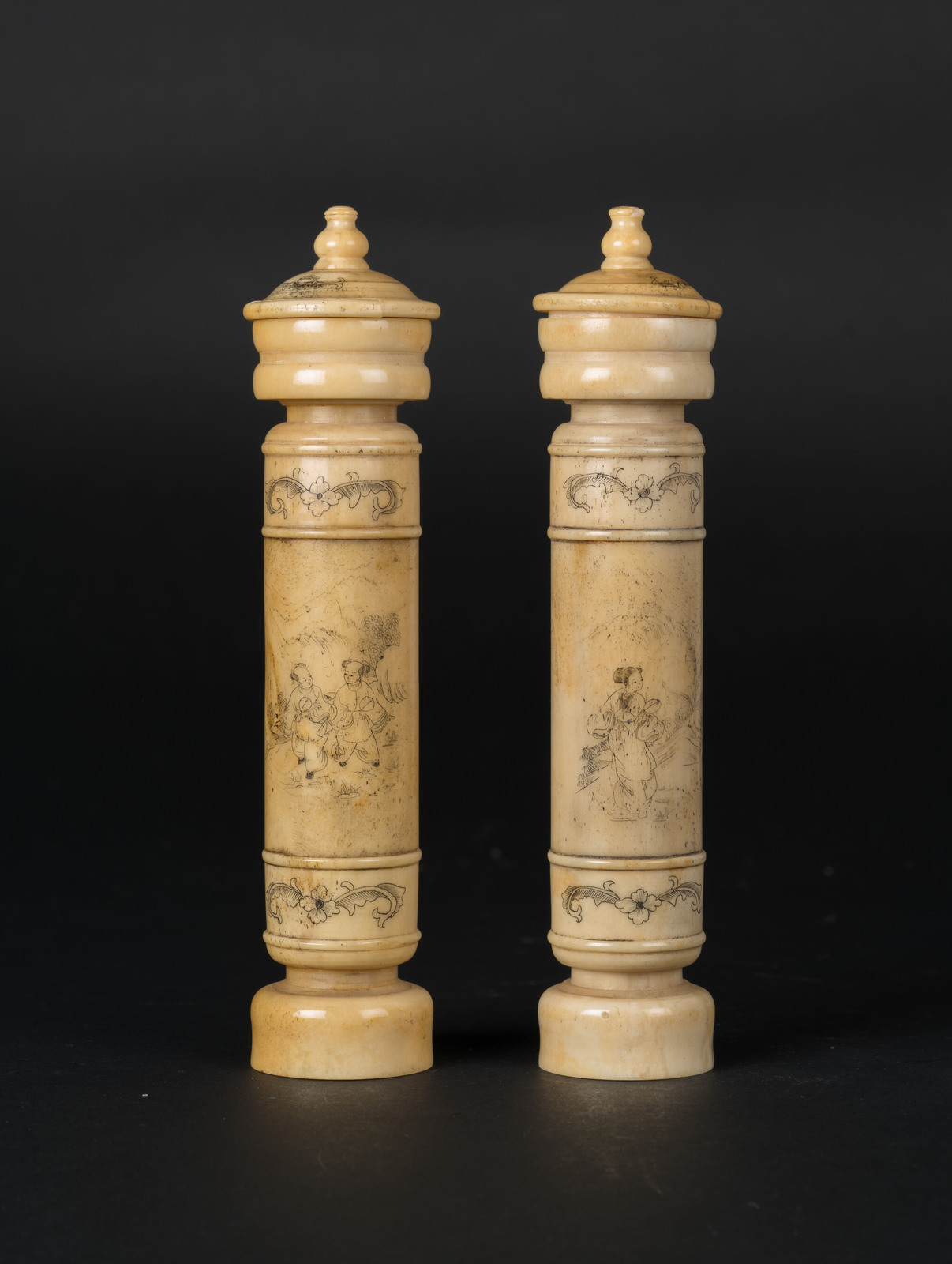 Arte Cinese Coppia di contenitori cilindrici in osso pirografato