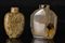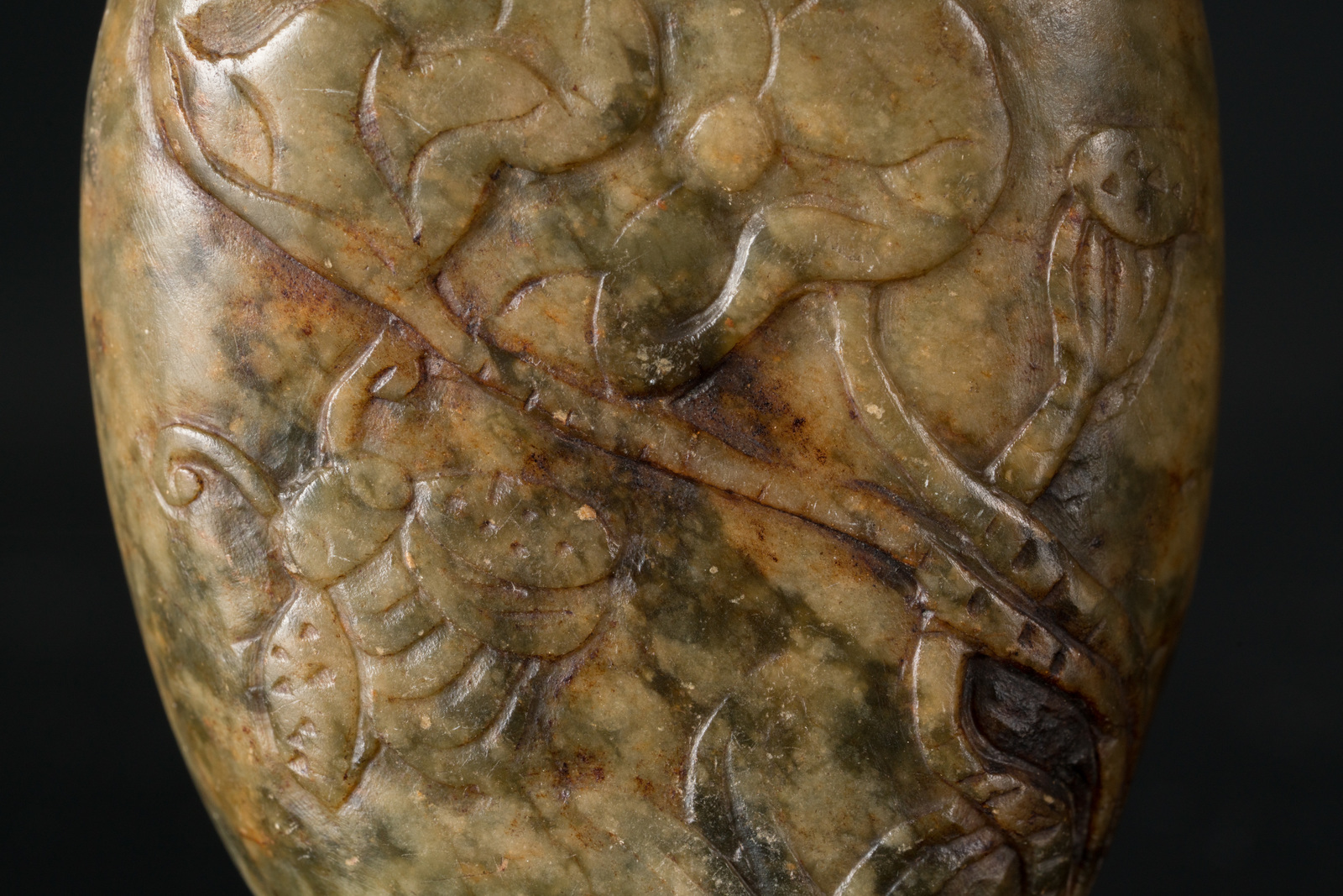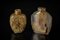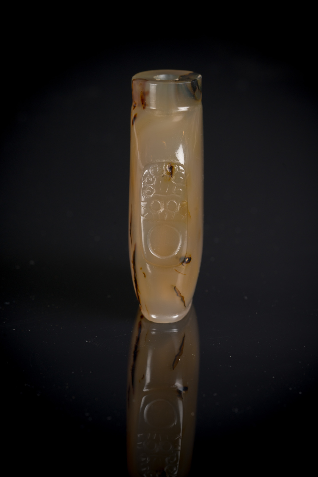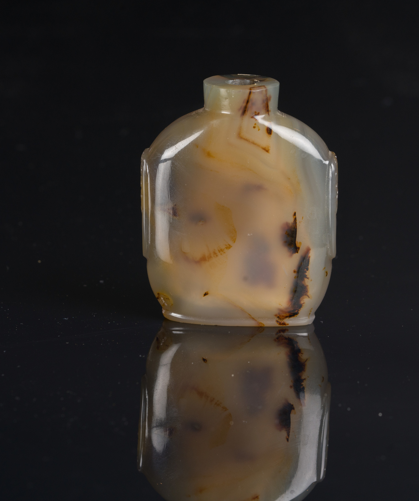 Cina, XIX secolo . . Cm 7,20. Quella in agata, mancante di tappo, è decorata con finti manici in forma di teste di leone incise; quella in giada, anch'essa mancante di tappo (h. 6,7 cm), è decorata con qilin, motivo vegetale e ape.