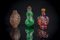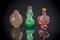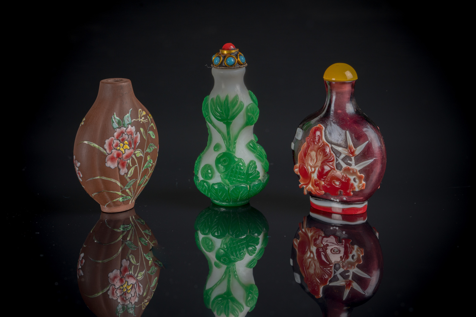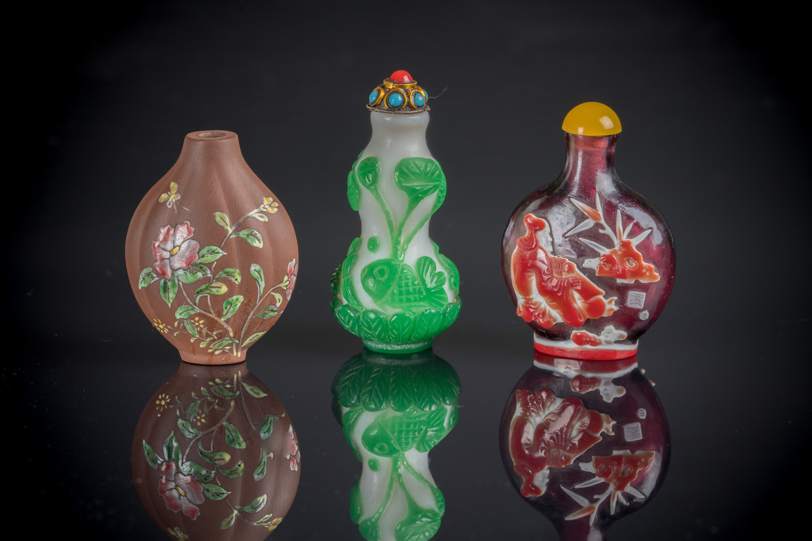 Cina, XIX secolo . . Cm 7,00. L'una in vetro a forma di doppia zucca decorata con applicazioni in vetro verde raffiguranti uno stagno, tappo incastonato con vetri colorati (h. 7 cm); una in vetro cameo con quattro sigilli (h. 6,5 cm); l'ultima Yixing in ceramica smaltata con motivi floreali (h. 6 cm).