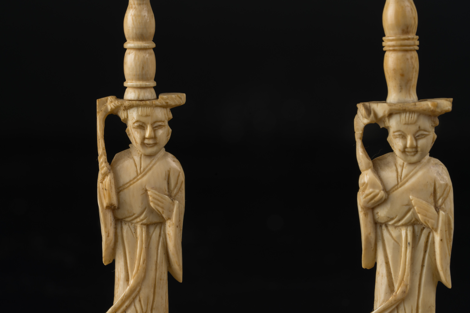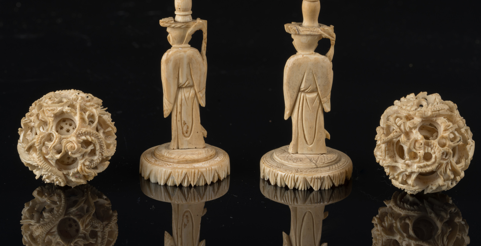Chinese Art A pair of ivory puzzle balls with caryatid high stemmed base