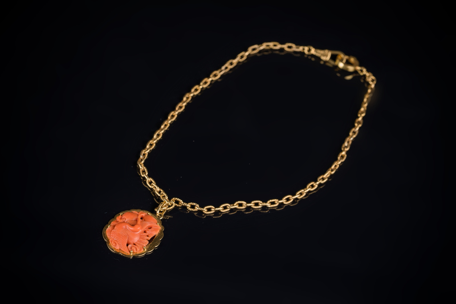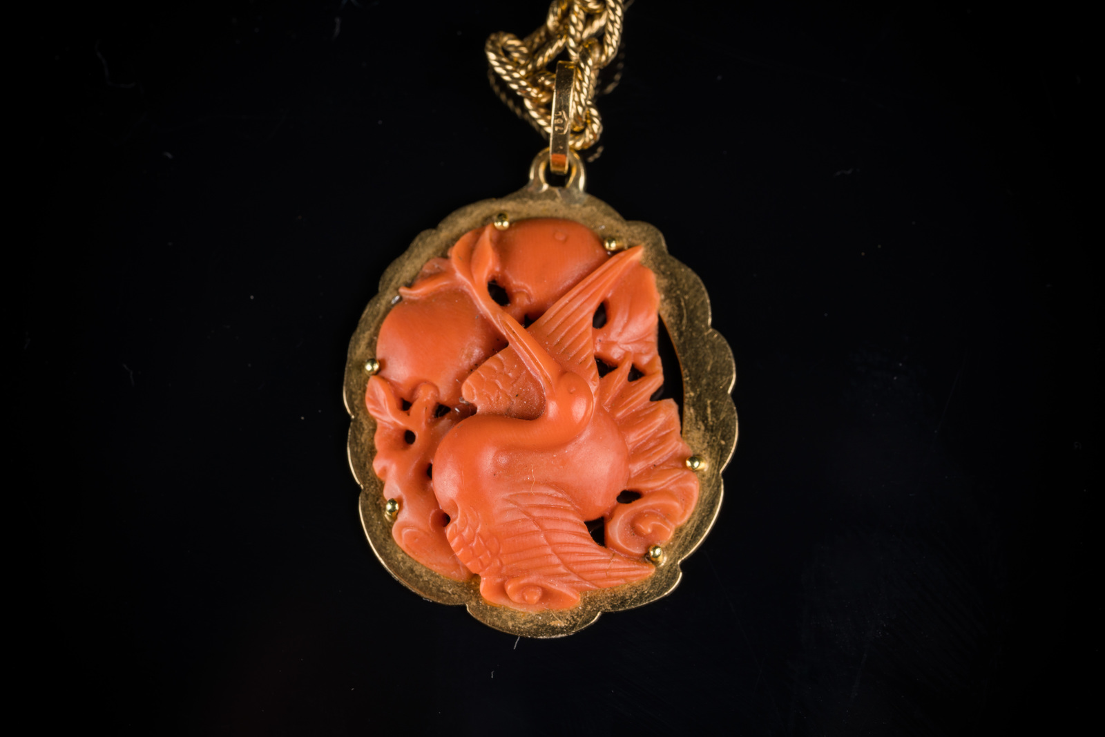 Chinese Art A gold necklace with coral pendant carved with a stork