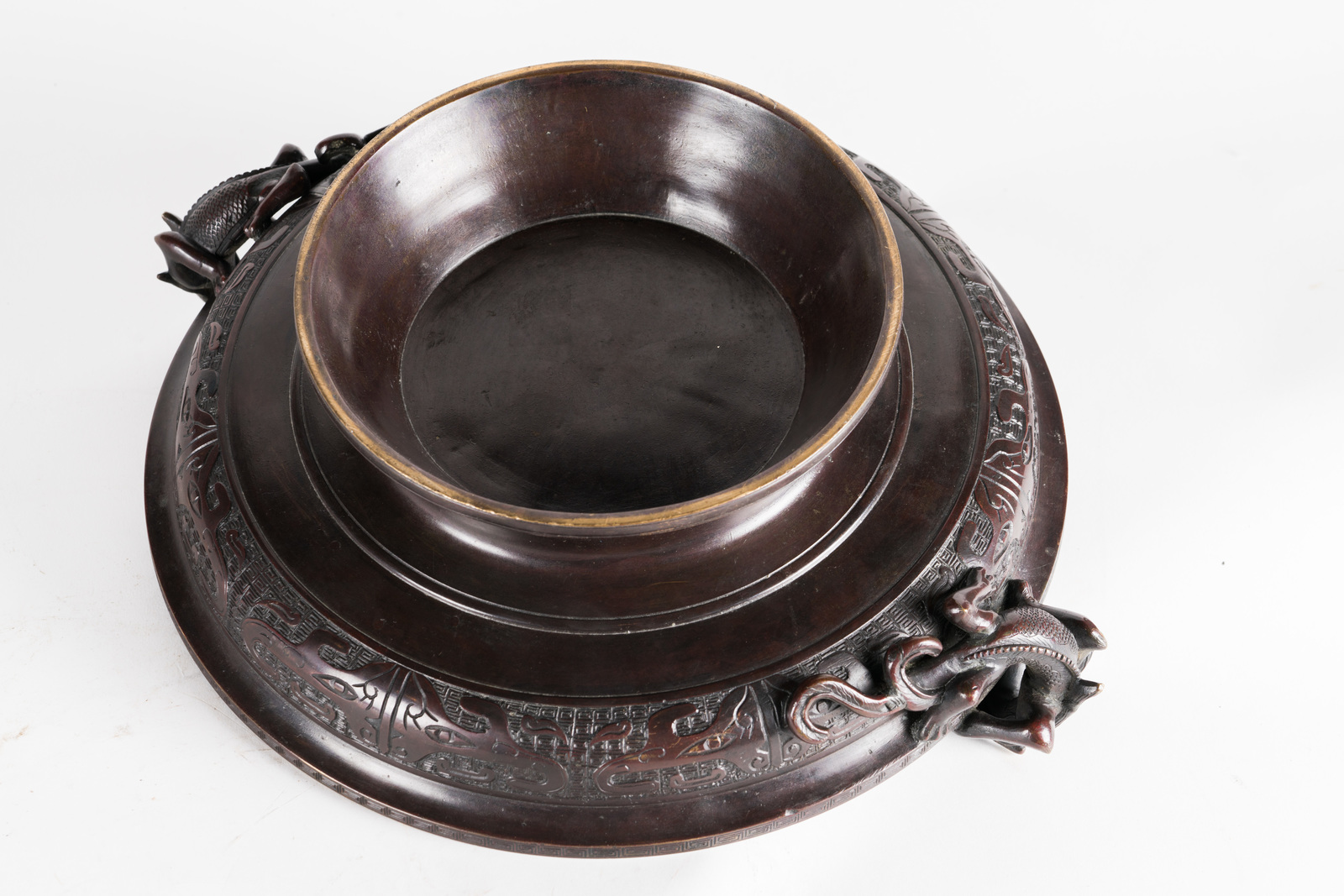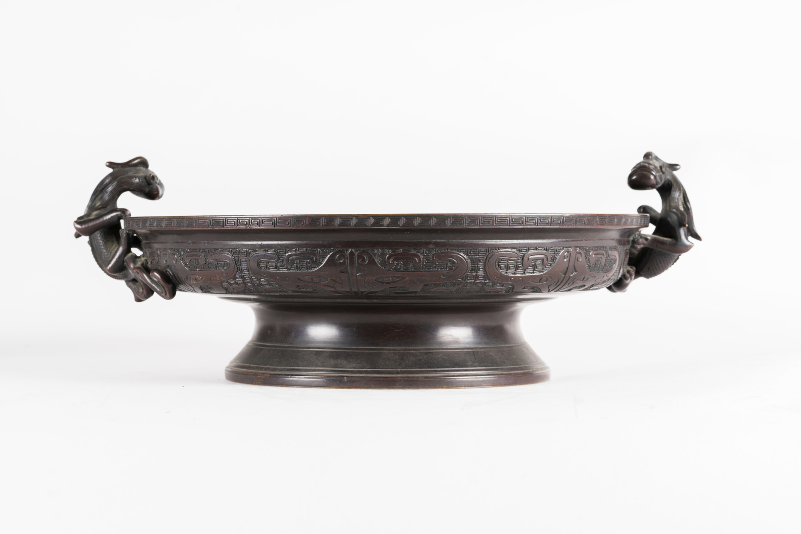 Arte Cinese Grande incensiere in bronzo con manici a chilong ed inciso con carpe