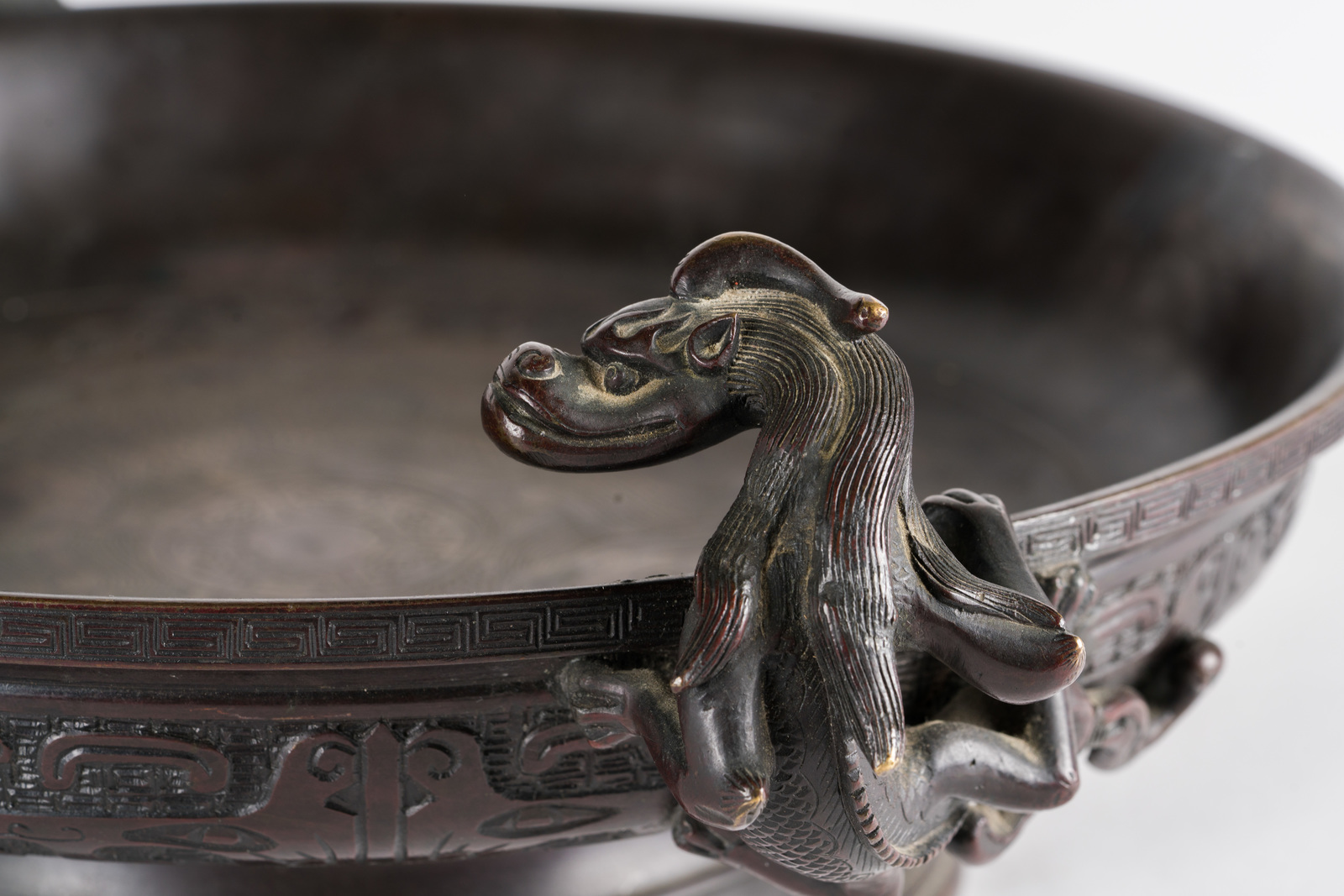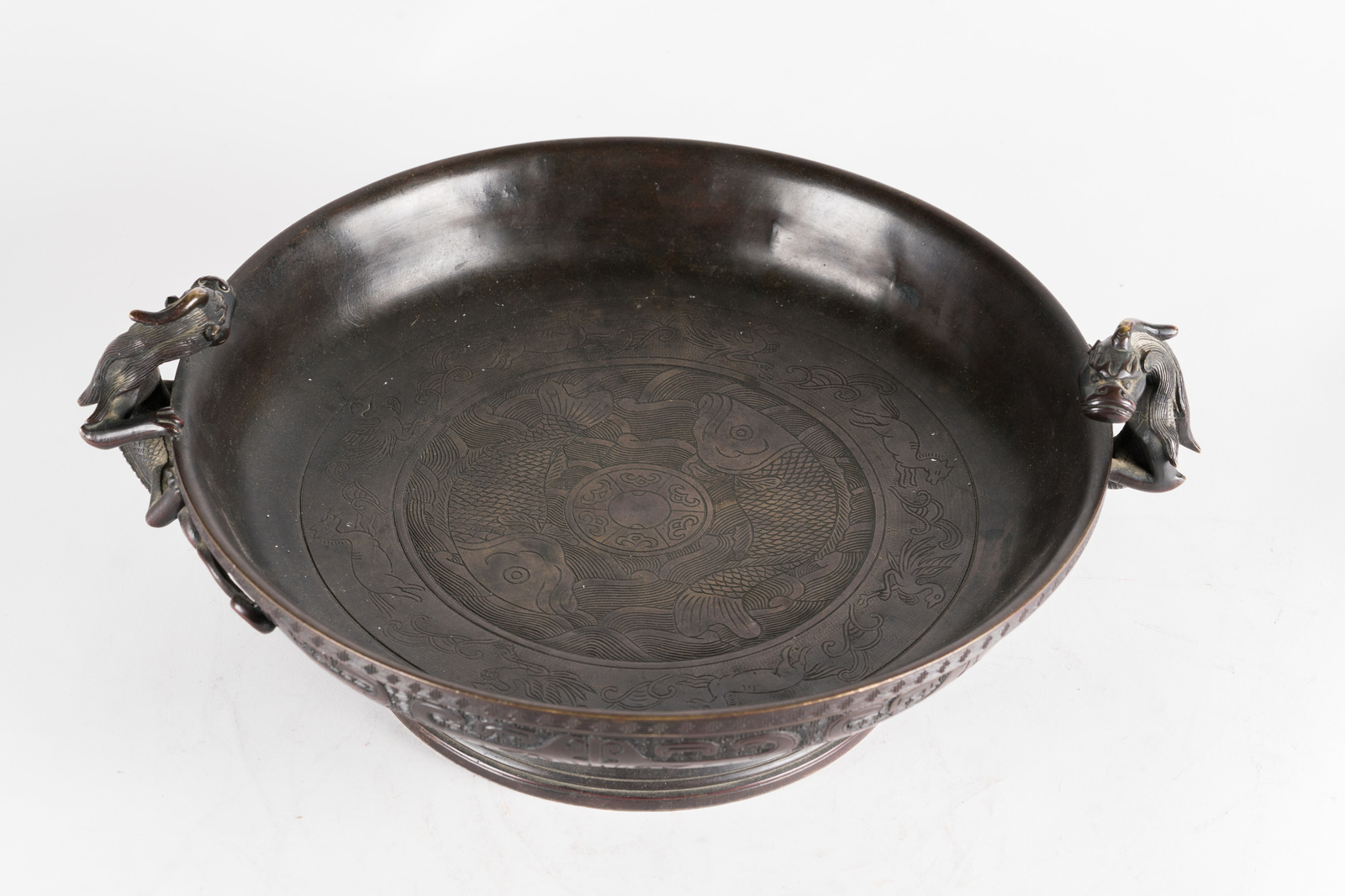 Chinese Art A bronze round censer engraved with carps among waves and bearing chilong handles