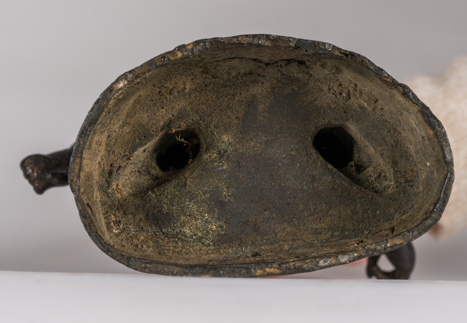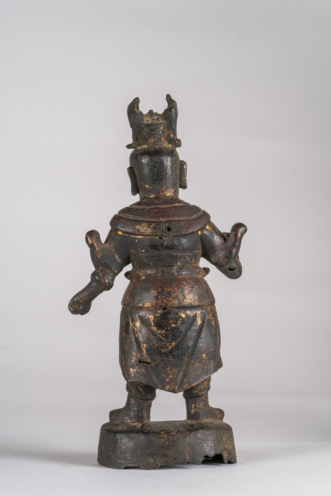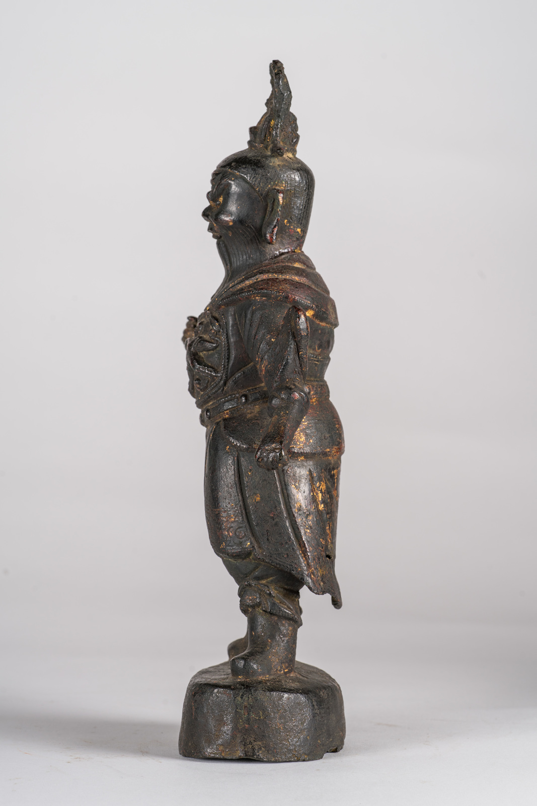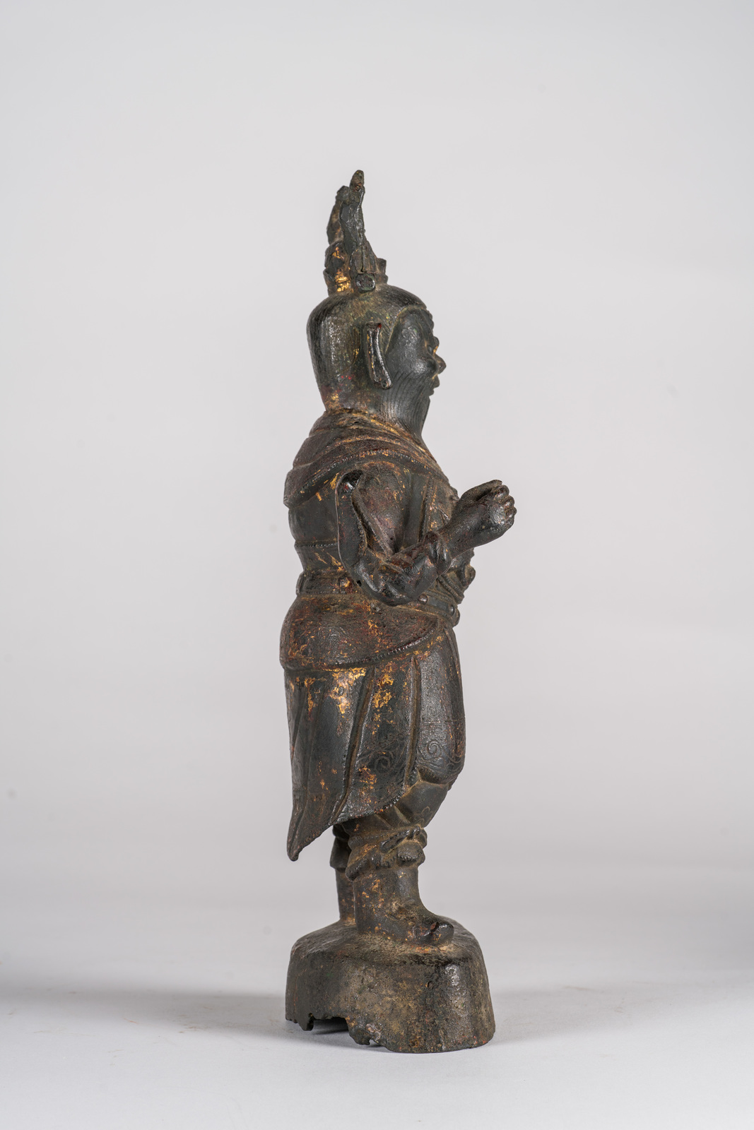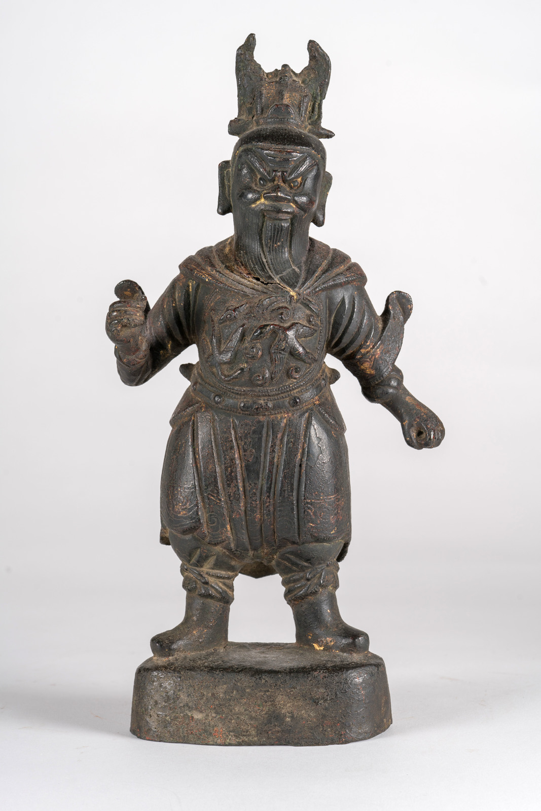 Cina, dinastia Ming, XVI secolo . . Cm 16,50 x 35,00. Fusione in bronzo a patina scura raffigurante, probabilmente, una figura infernale del pantheon taoista stante su base rialzata. Volto semi-irato con lunga barba, armatura decorata con animali sul petto e larghi pantaloni incisi a motivi fitomorfi.