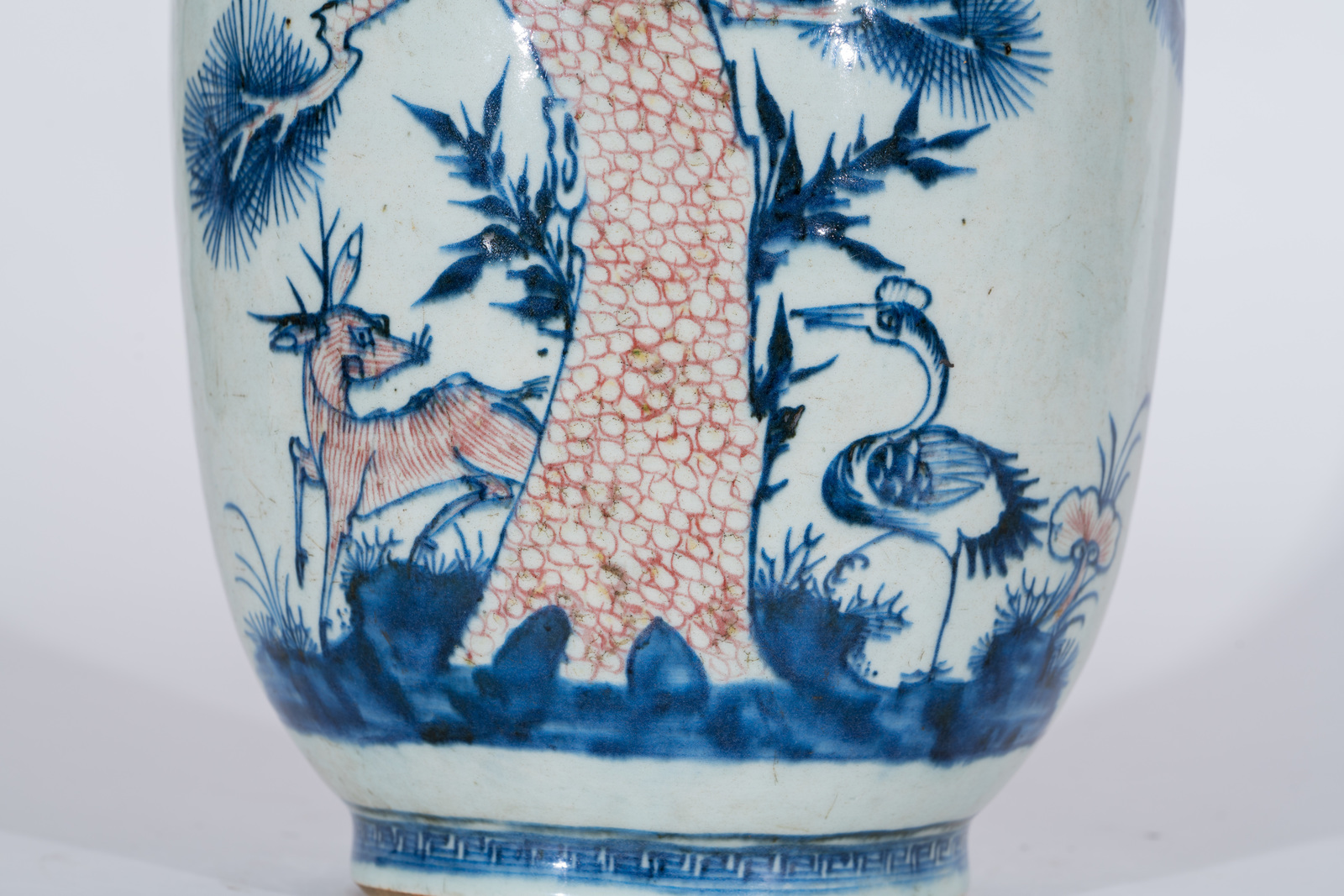 Chinese Art A blue and copper red porcelain vase decorated with vegetal motifs, a deer and a crane