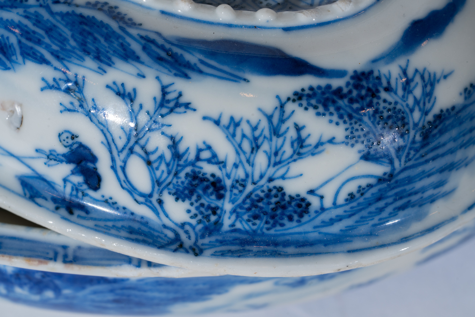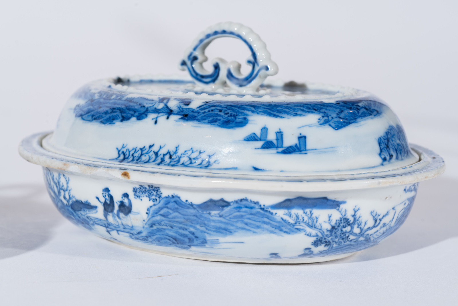 Cina, dinastia Qing, XVIII secolo . . Cm 19,00 x 9,00 x 14,50. di forma ovale, il corpo delicatamente dipinto con personaggi in paesaggio montuoso. Il coperchio e l'impugnatura ulteriormente decorati con piccole perline stampate a rilievo. Il fondo reca marchio dipinto a quattro caratteri che cita il palazzo imperiale di Pechino. La più piccola misura 16,5 X 9 cm.