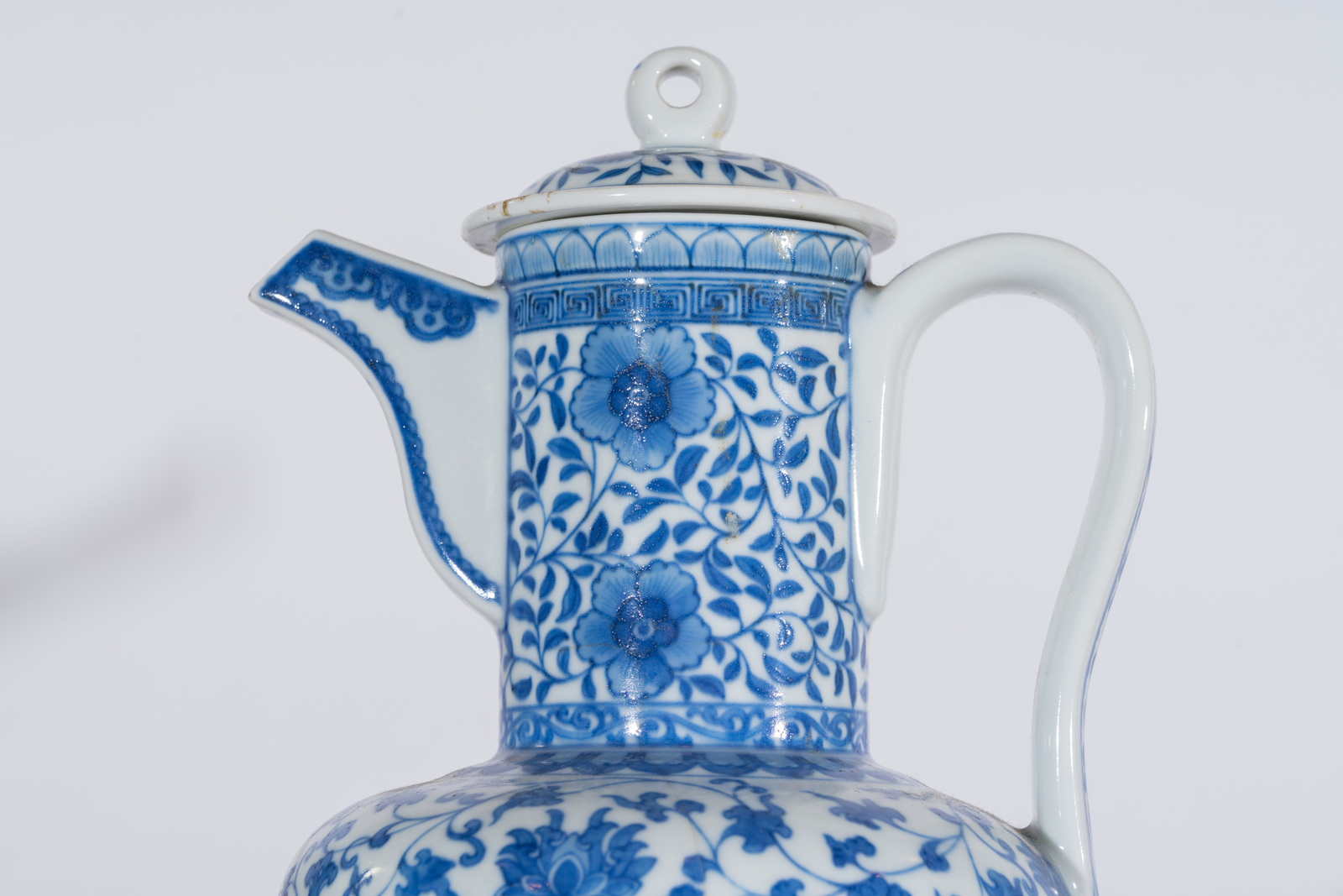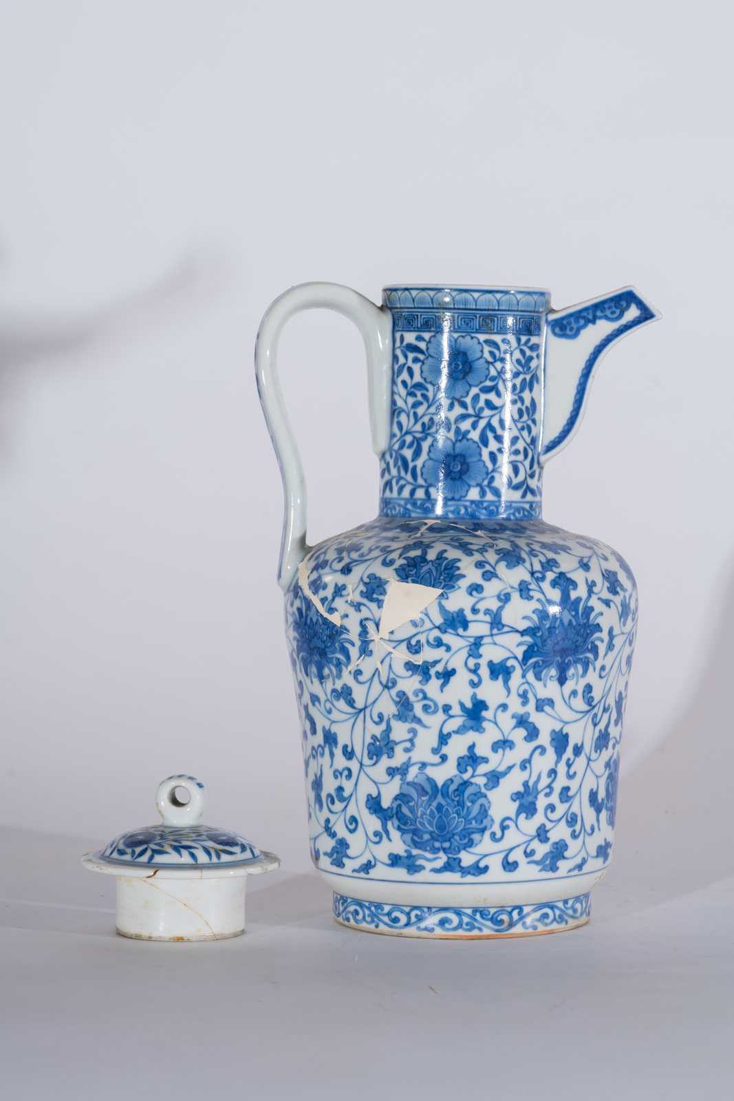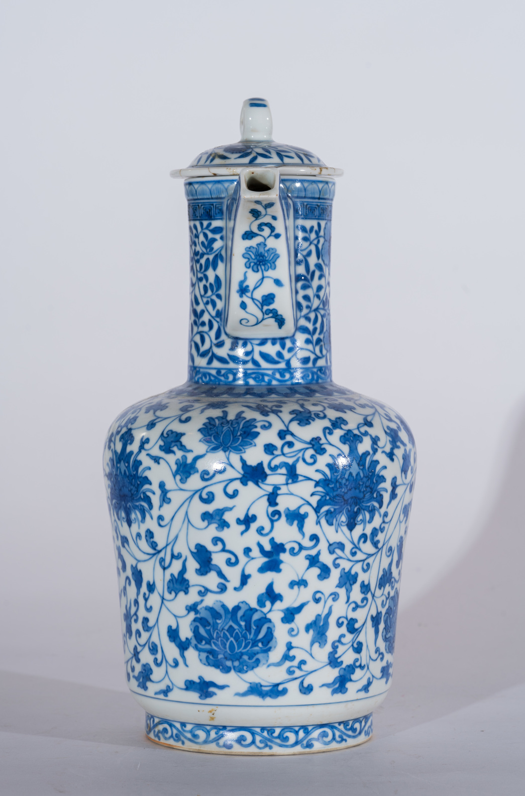 Chinese Art A blue and white porcelain ewer and cover painted with interlaced lotus flowers and bearing an apocryphal Xuande mark at the base China, Qing dynasty, 18th century . . Cm 18,50 x 29,00.