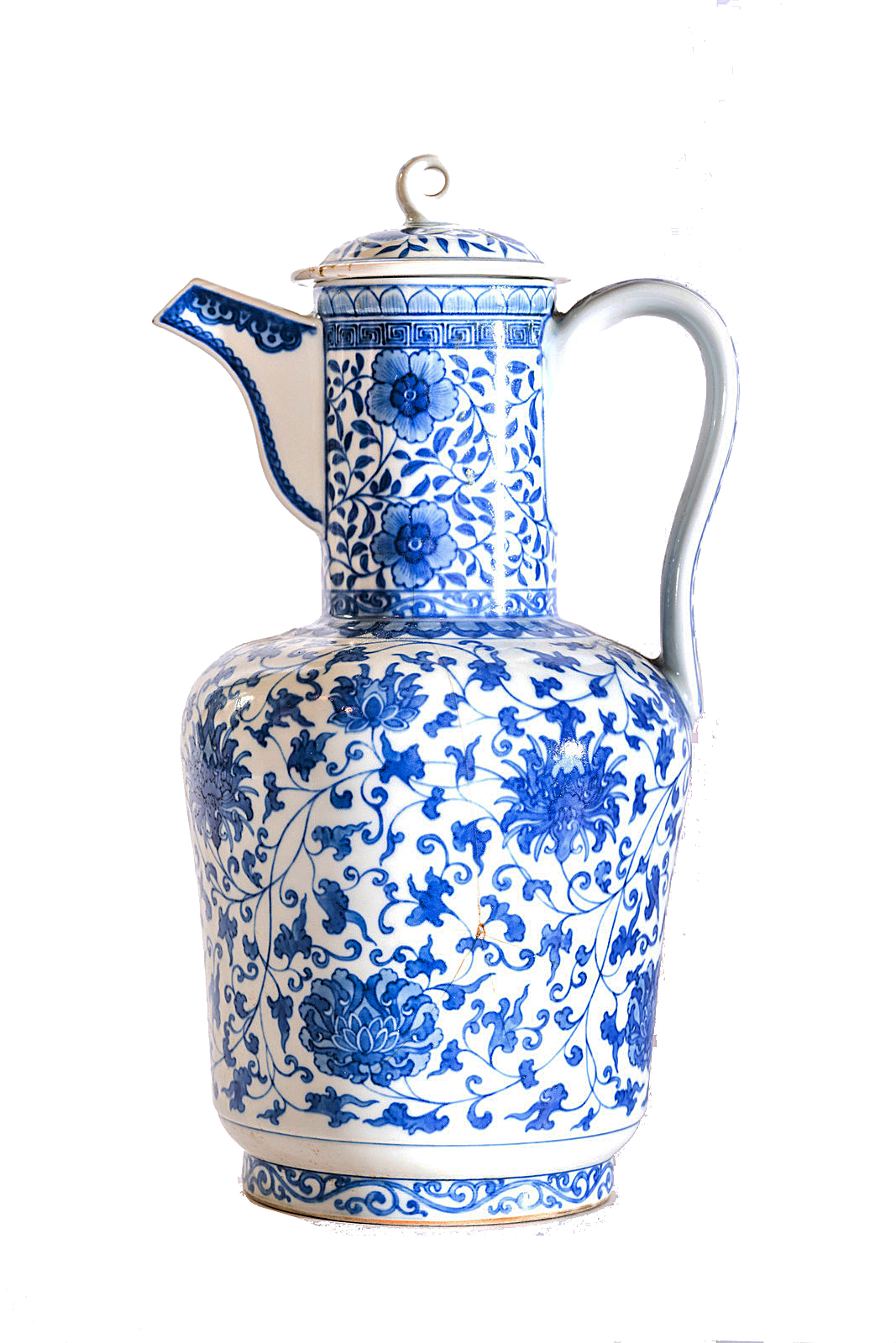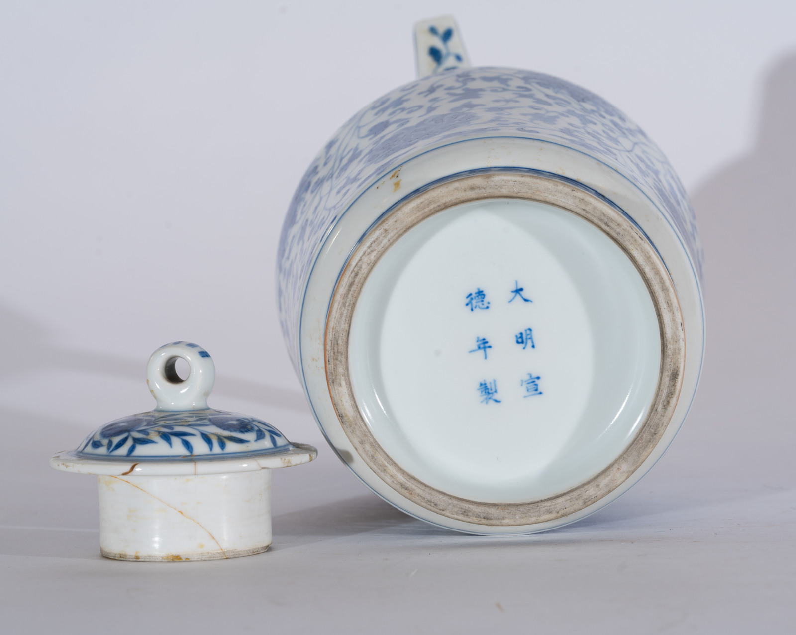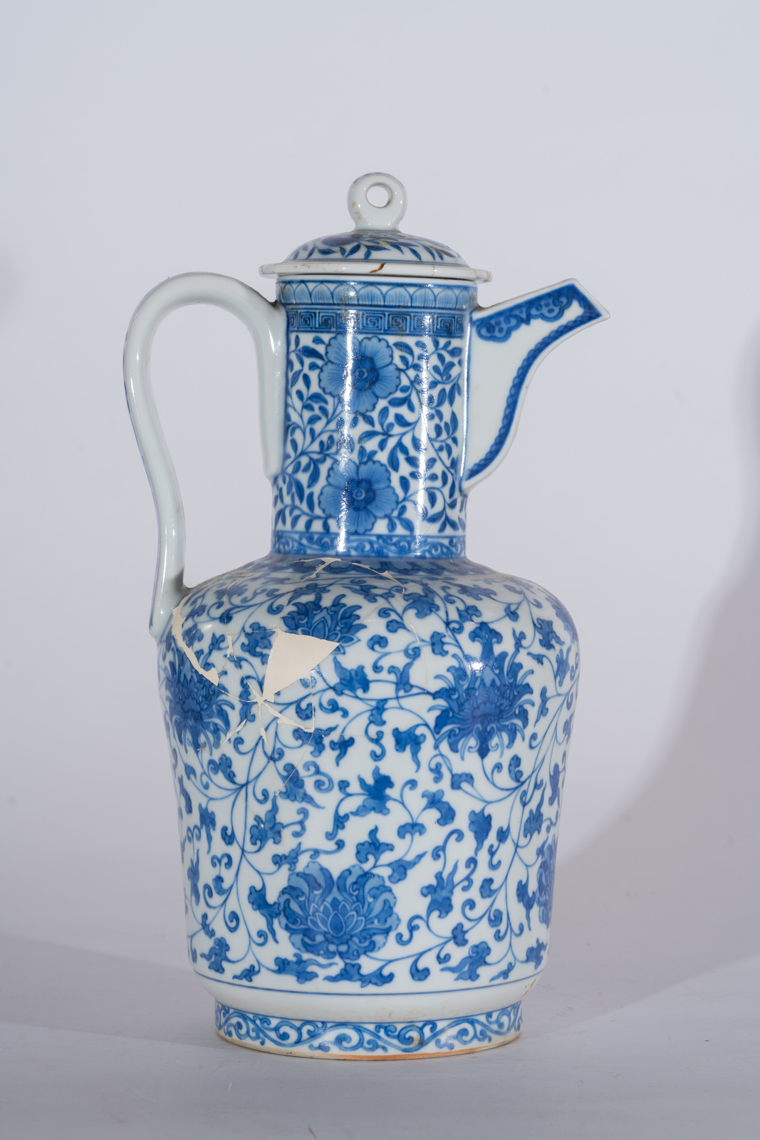 Chinese Art A blue and white porcelain ewer and cover painted with interlaced lotus flowers and bearing an apocryphal Xuande mark at the base China, Qing dynasty, 18th century . . Cm 18,50 x 29,00.