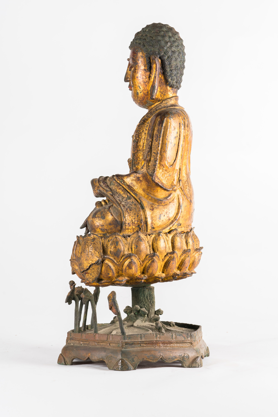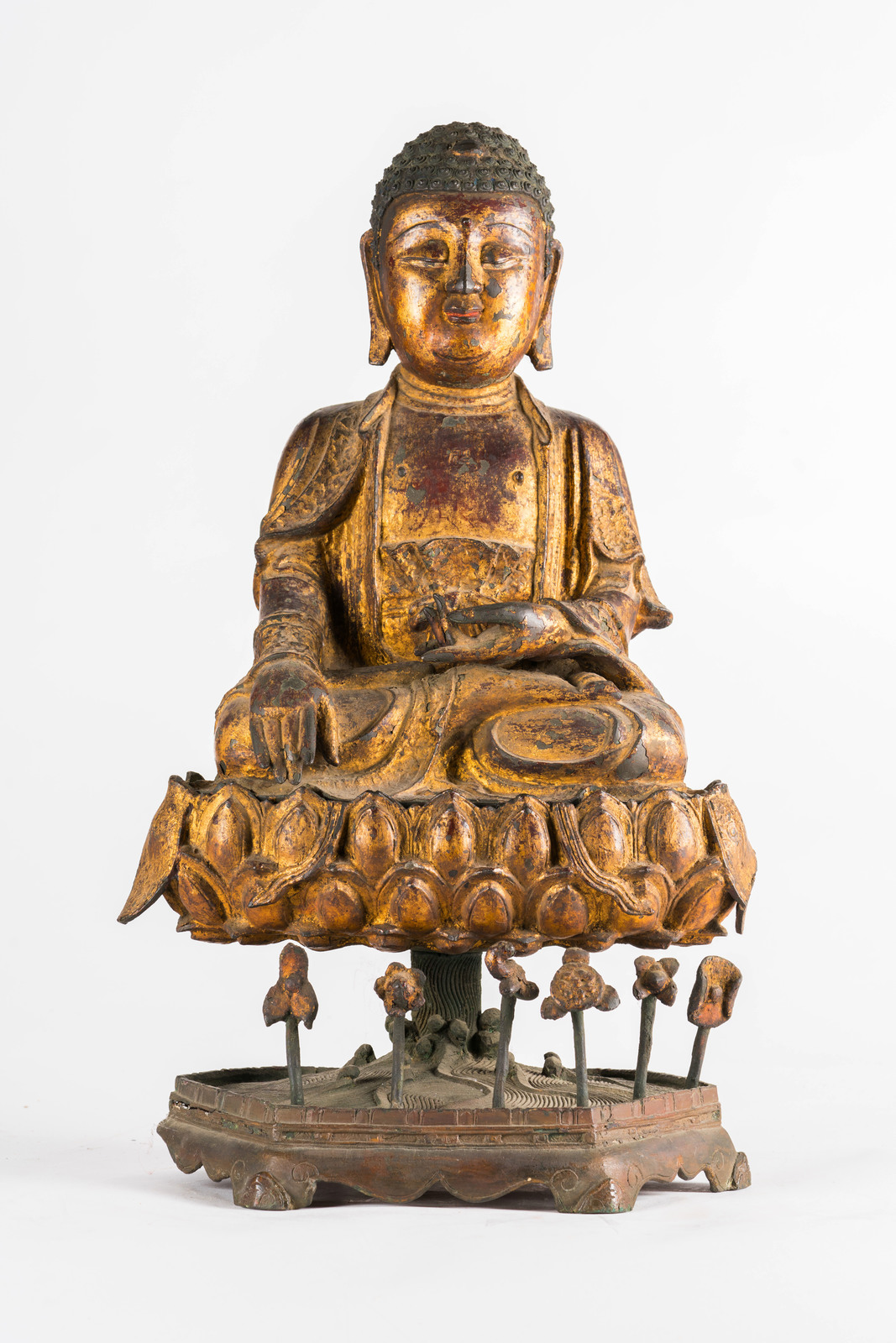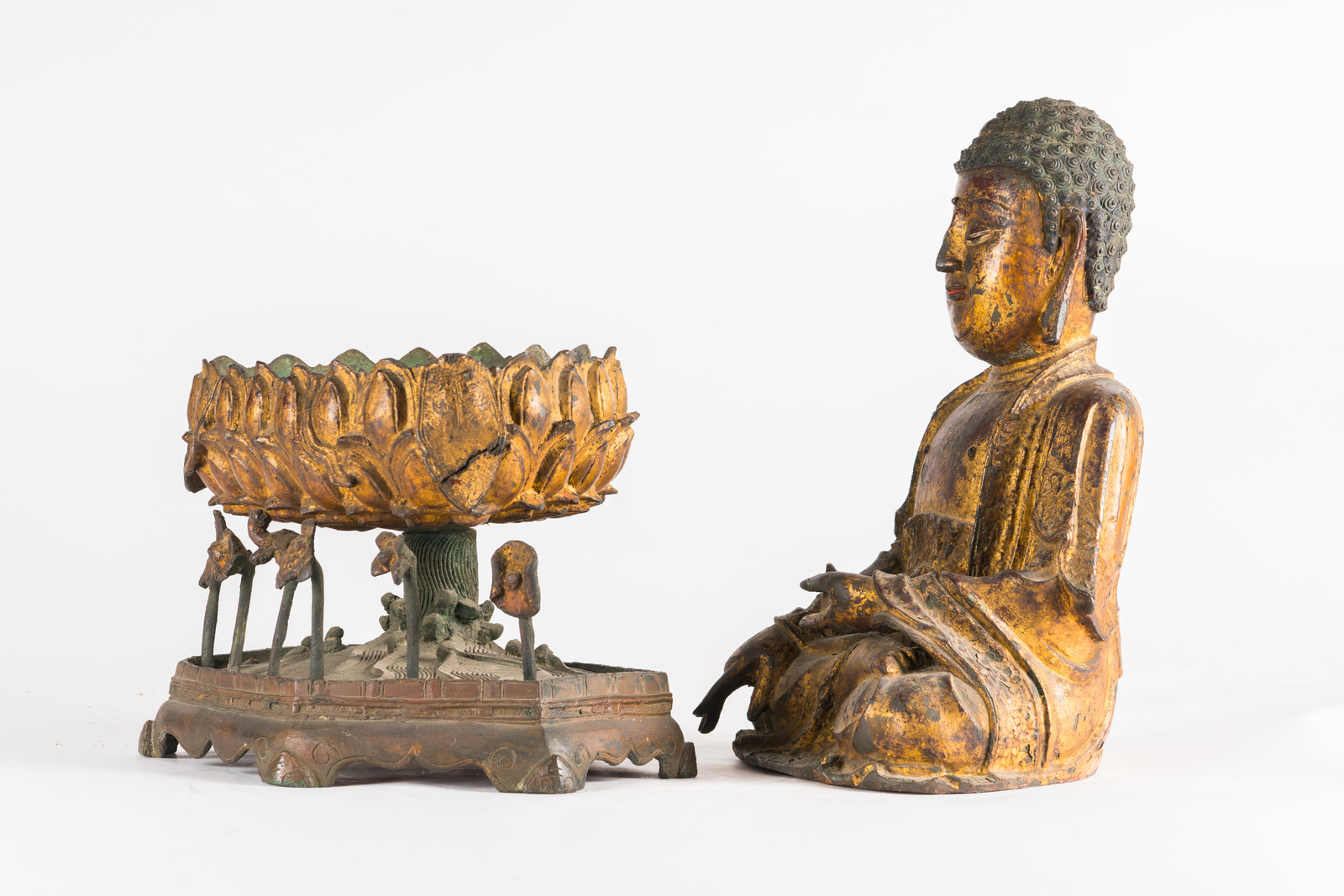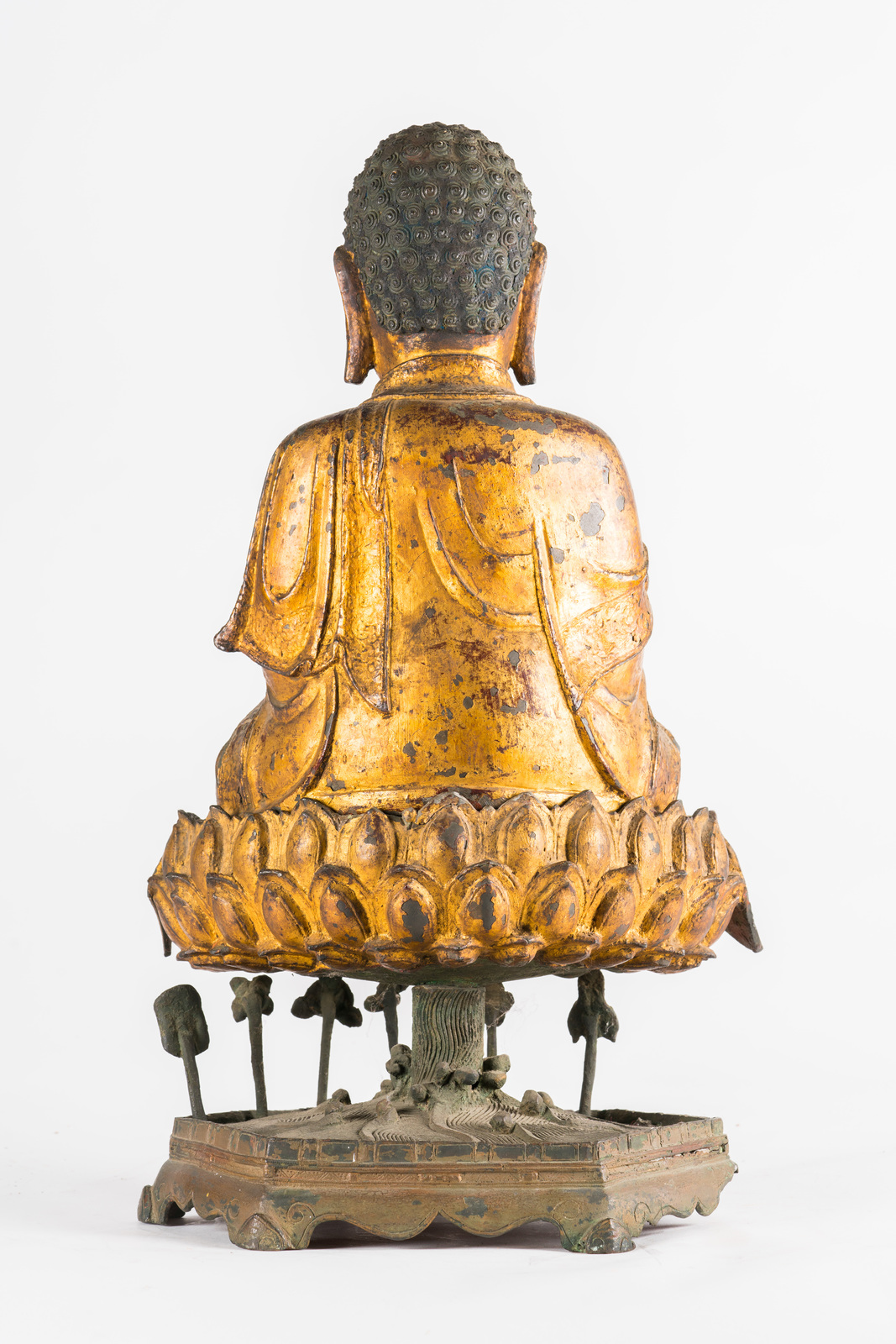 Le fusioni in bronzo laccato e dorato si diffusero largamente in Cina durante tutto il XVI secolo. Esemplari di grandi dimensioni, come quelli qui presentati, sono tuttavia piuttosto rari e destinati a committenze rilevanti. Inoltre, data la fragilità della laccatura su bronzo, è altresì raro trovare degli esemplari che abbiano mantenuto quasi integro il rivestimento di finitura. Rara anche la completezza dei soggetti con la loro base rialzata originale, in questo caso ancora adornata di foglie di loto sporgenti.