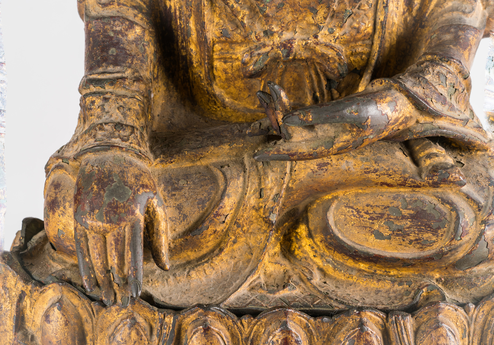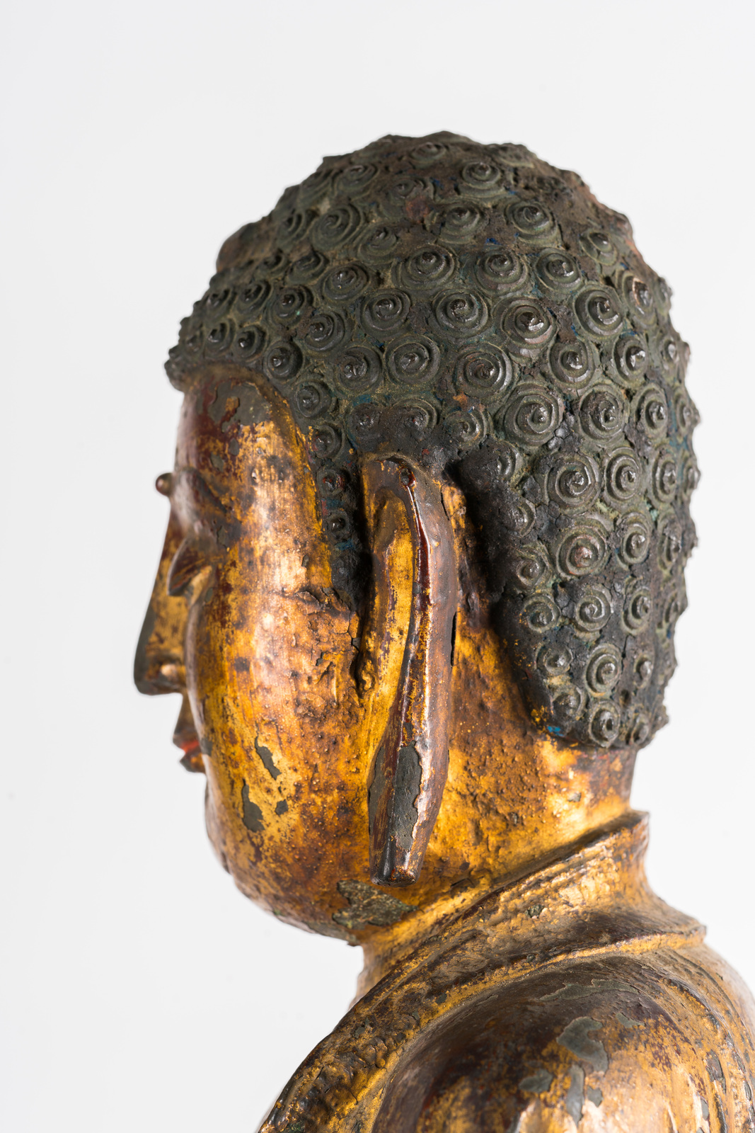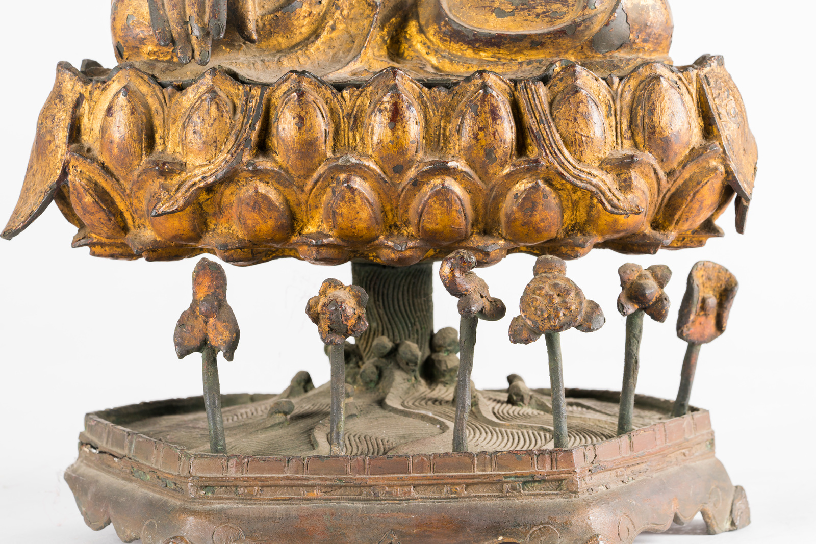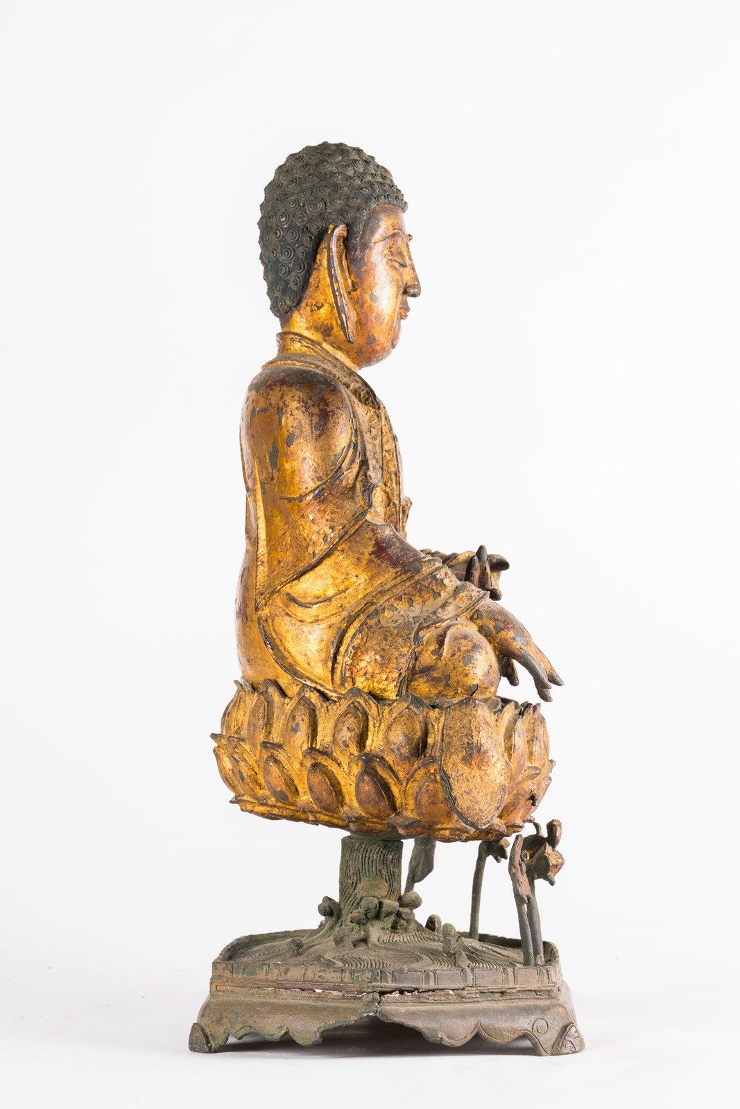 Le fusioni in bronzo laccato e dorato si diffusero largamente in Cina durante tutto il XVI secolo. Esemplari di grandi dimensioni, come quelli qui presentati, sono tuttavia piuttosto rari e destinati a committenze rilevanti. Inoltre, data la fragilità della laccatura su bronzo, è altresì raro trovare degli esemplari che abbiano mantenuto quasi integro il rivestimento di finitura. Rara anche la completezza dei soggetti con la loro base rialzata originale, in questo caso ancora adornata di foglie di loto sporgenti.