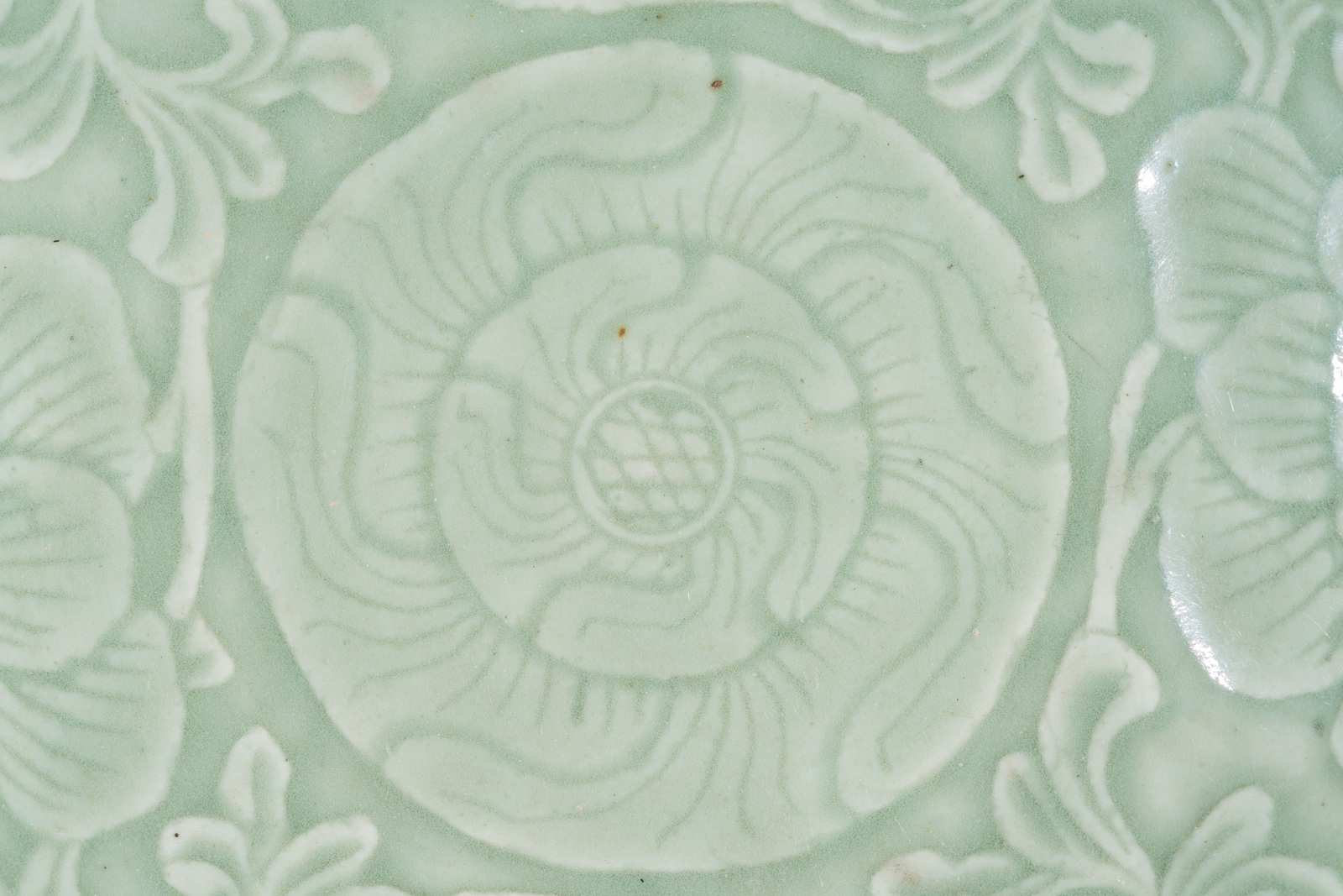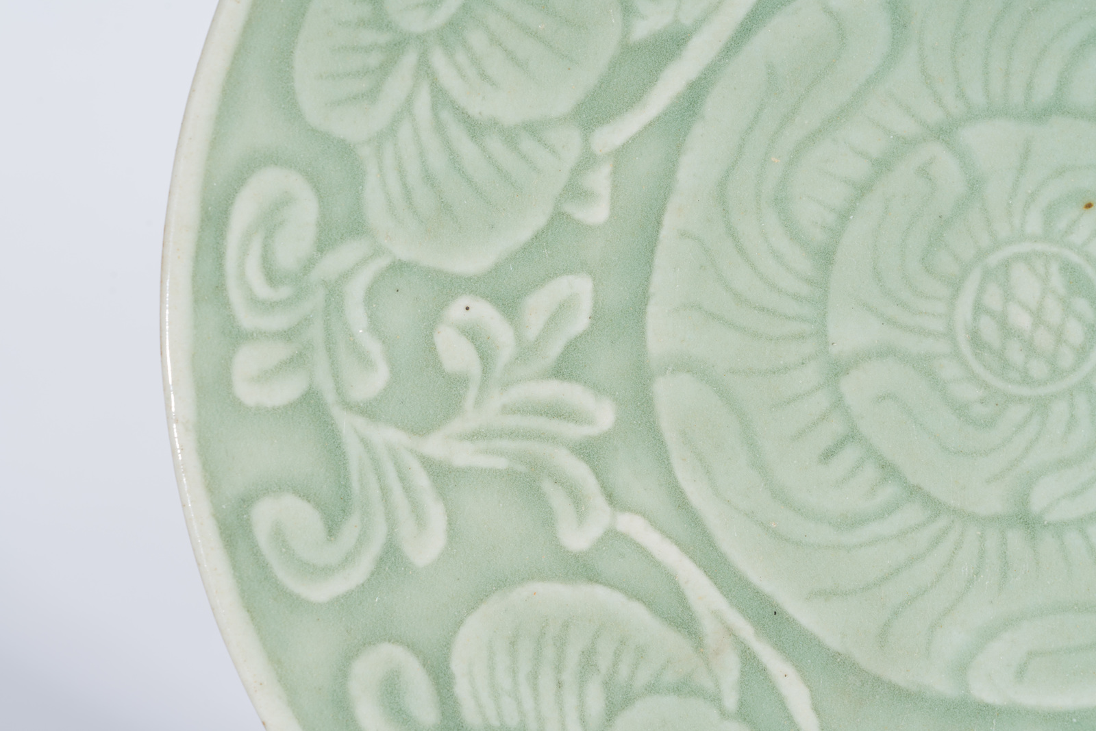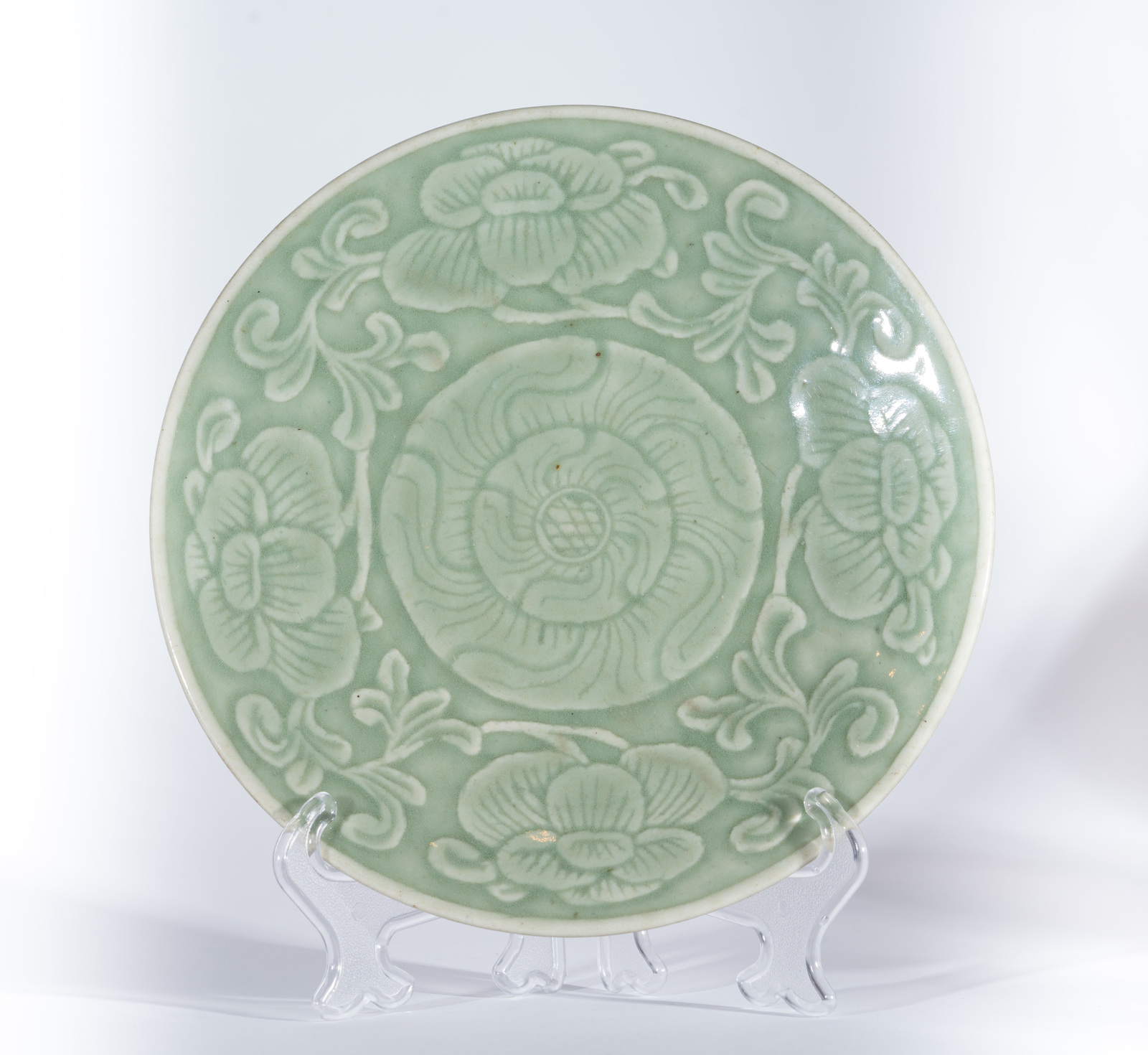 Chinese Art A celadon Longquan pottery dish engraved with peonies