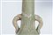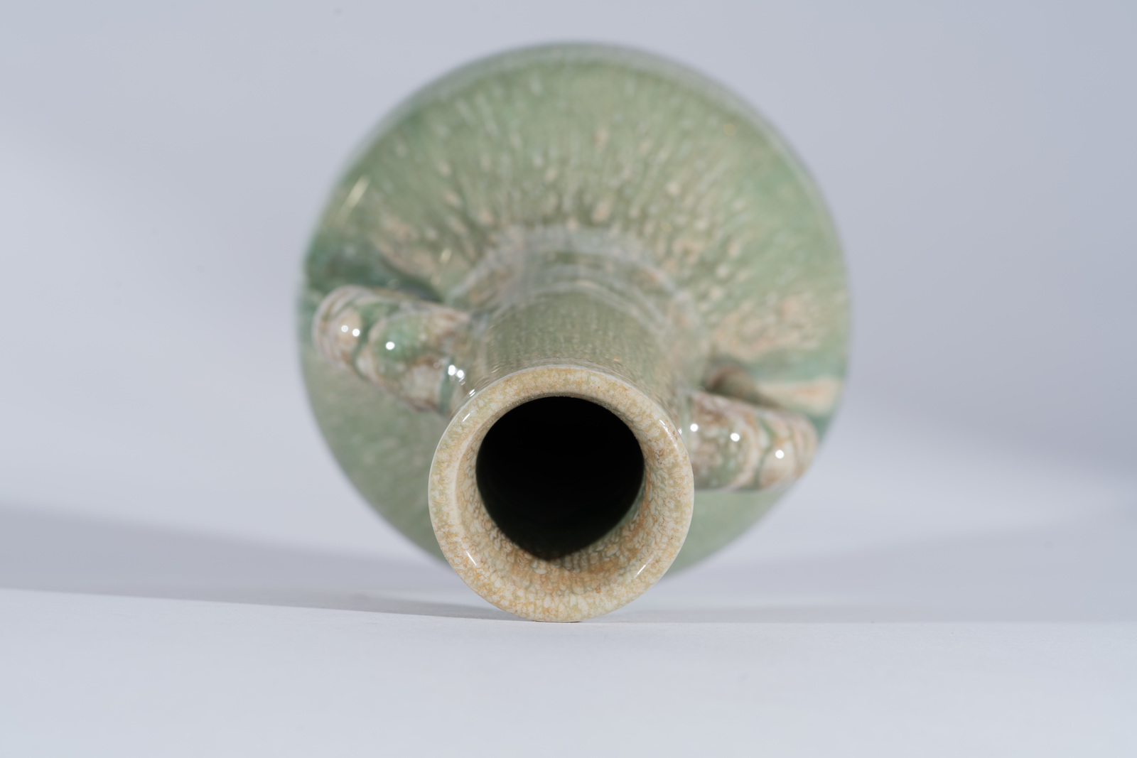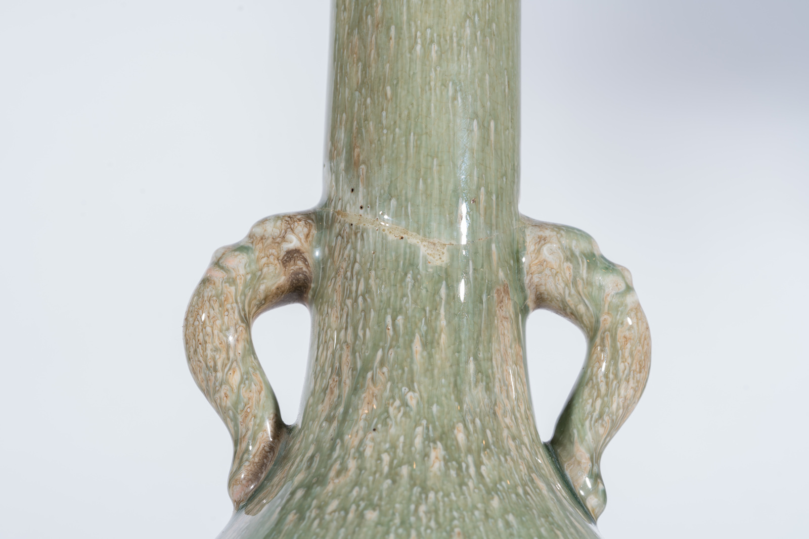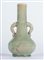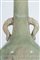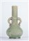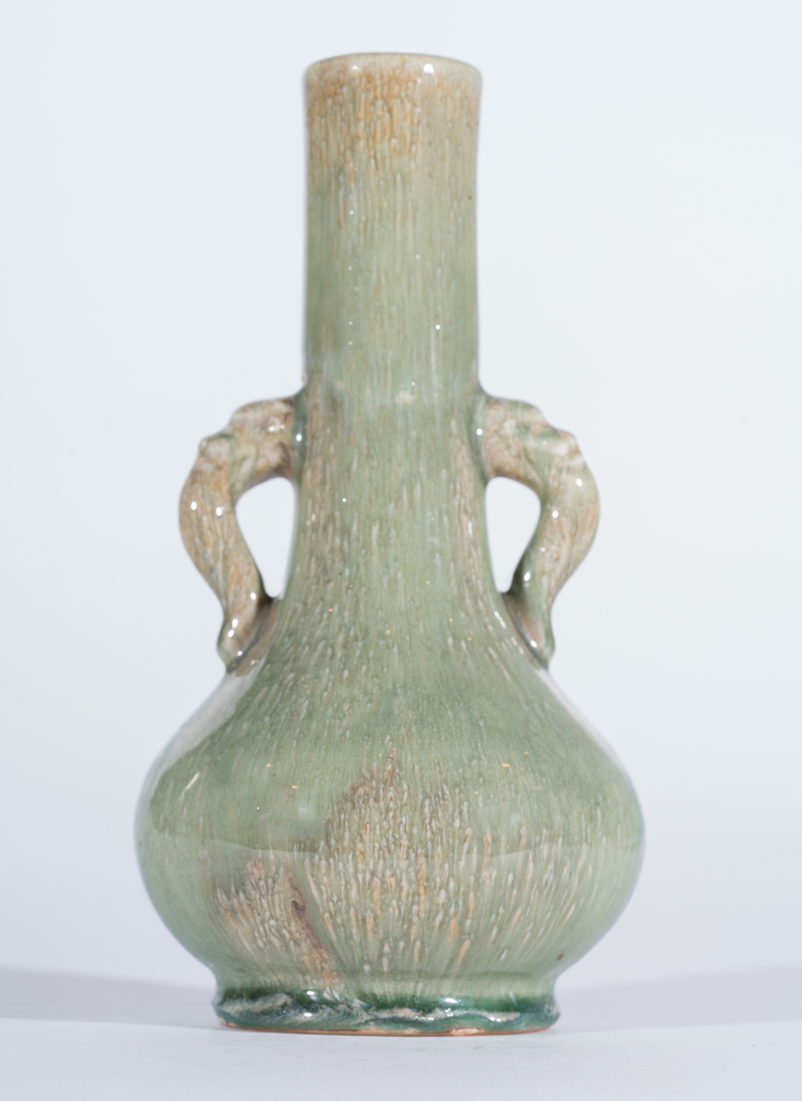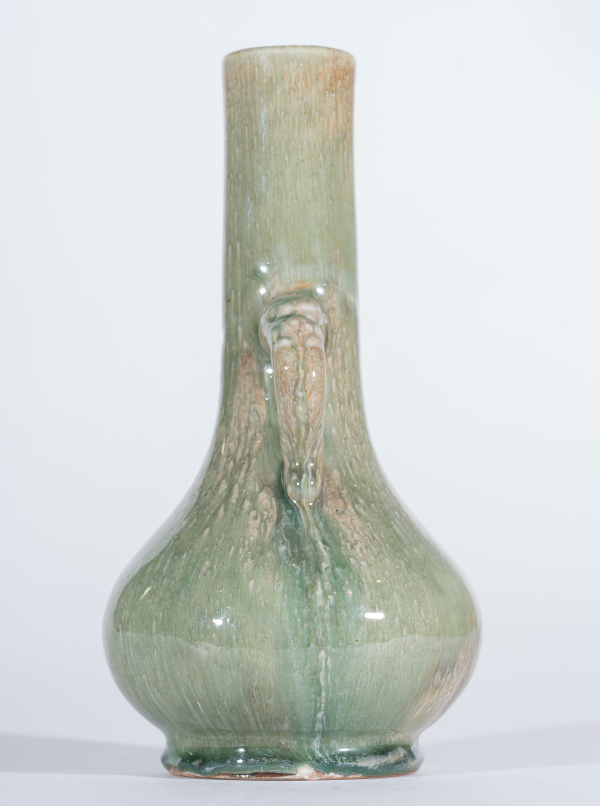 Cina, dinastia Qing, XIX secolo . . Cm 12,00 x 23,50. poggiante su disco, il corpo piriforme con alto collo dritto e doppio manico zoomorfo. L'oggetto è rivestito di spessa invetriatura verde con colature in tono.