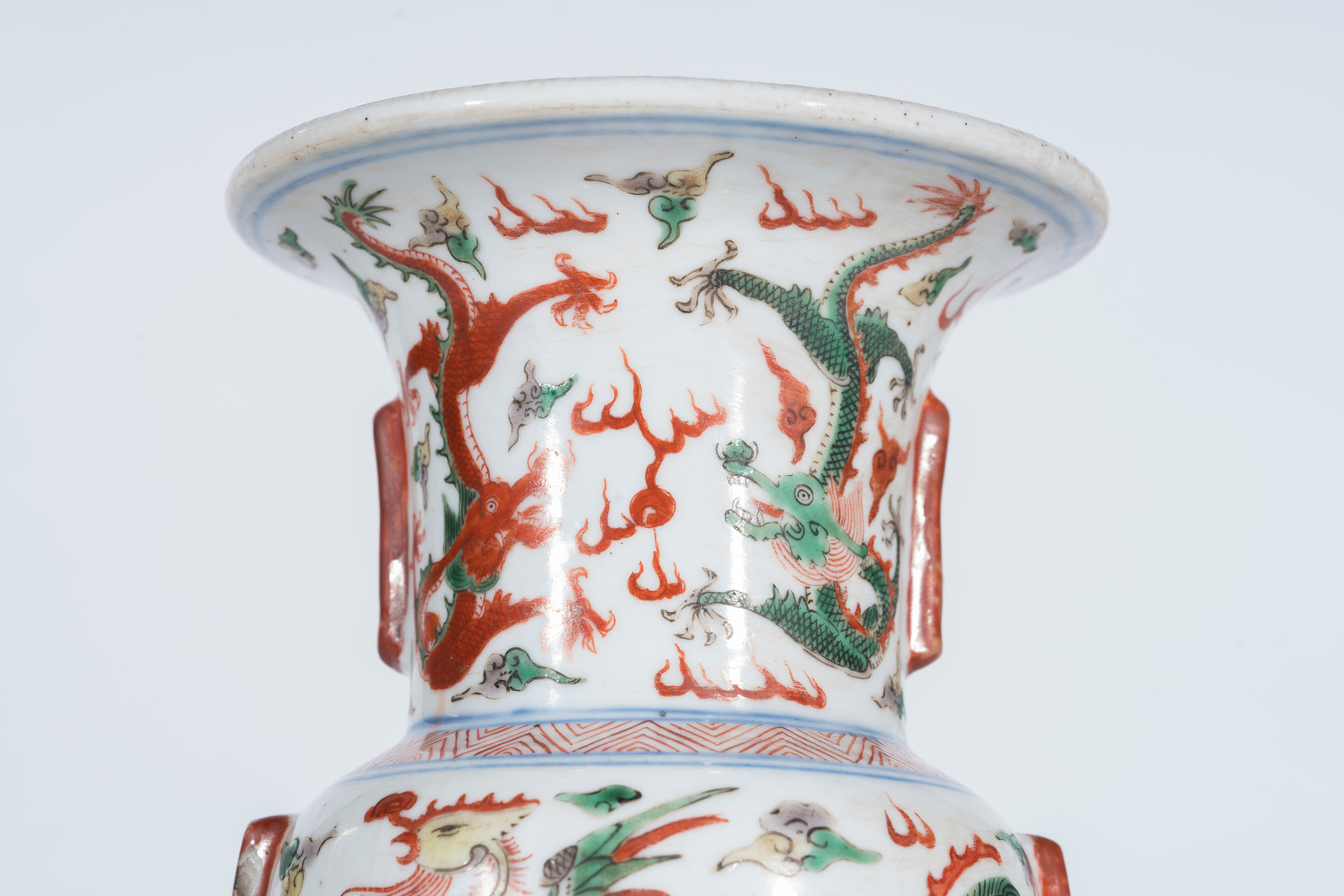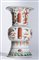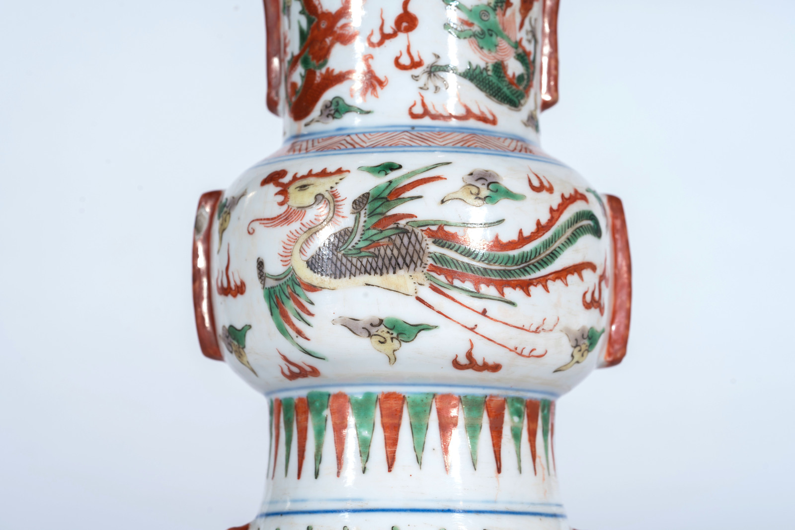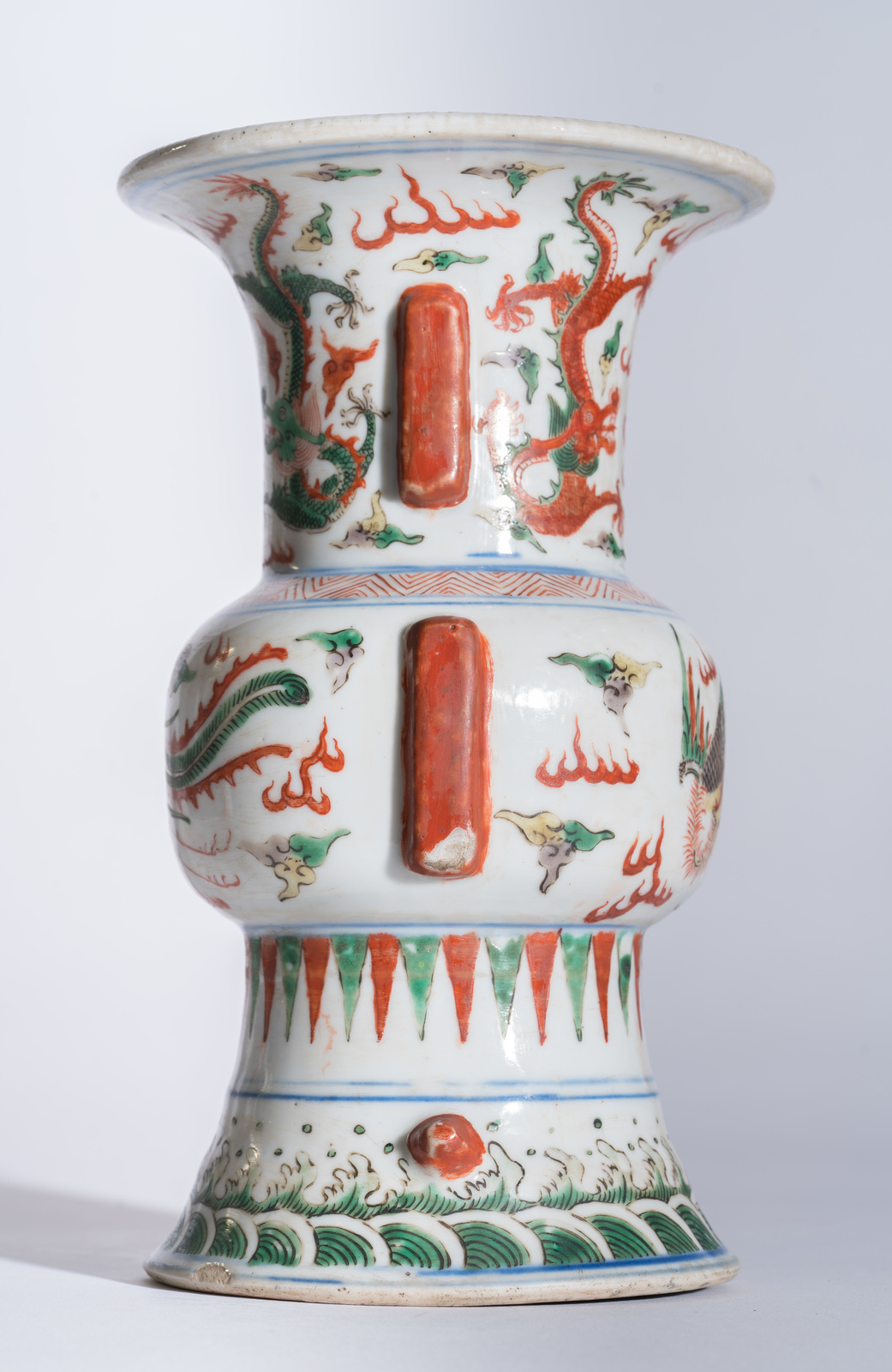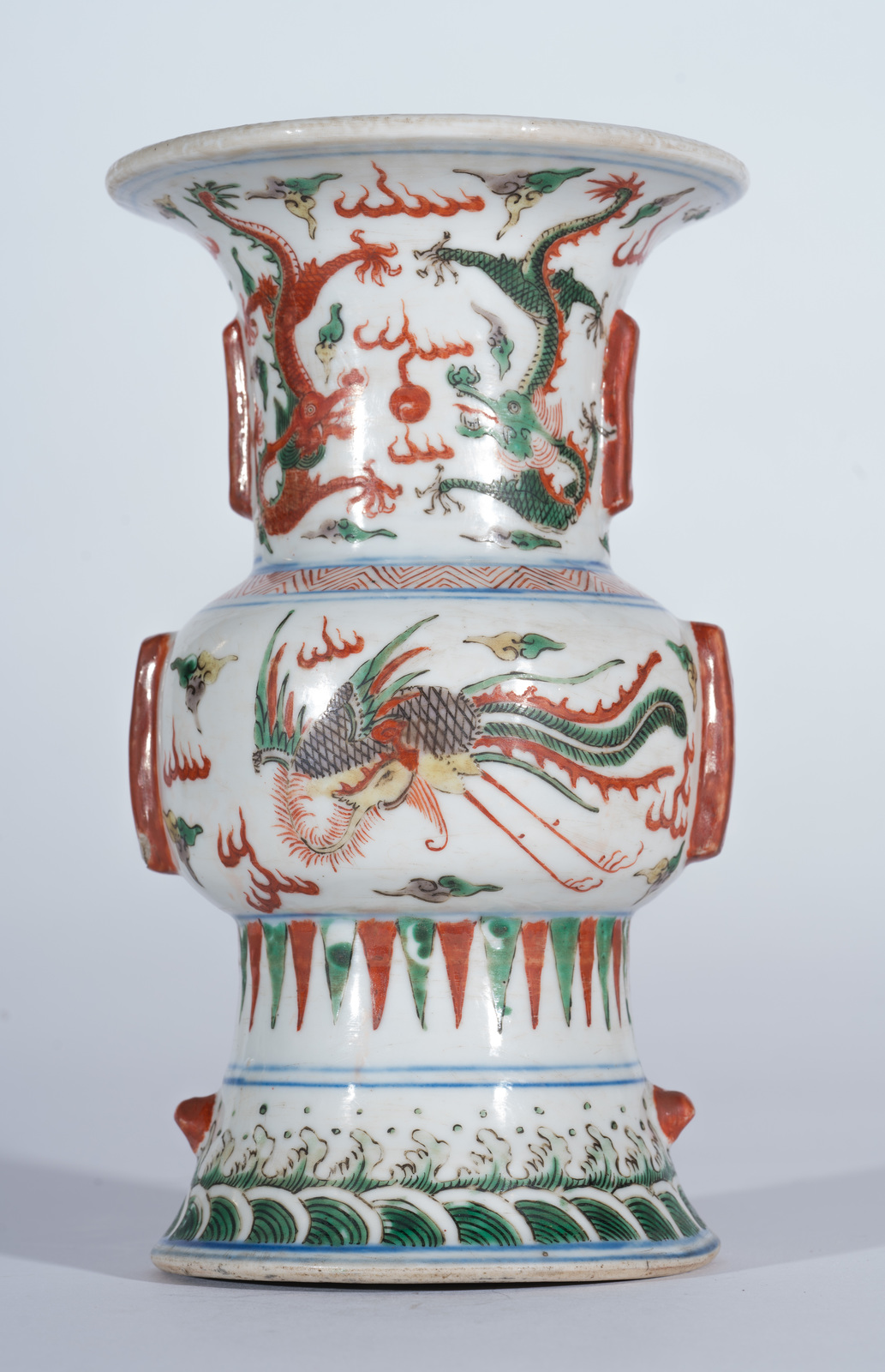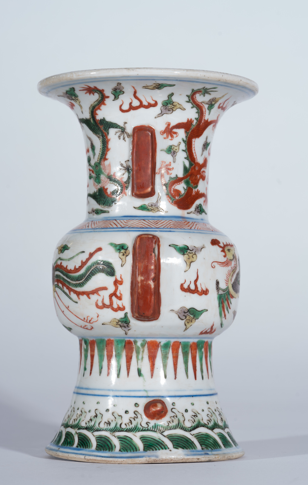 Cina, dinastia Ming, periodo Jiajing, 1522-1566 . . Cm 13,50 x 22,60. Importante vaso in forma arcaica mutuata dai bronzi da vino Shang e caratterizzata da collo e base fortemente svasati e da costolature aggettanti sul corpo, la superficie finemente dipinta con smalti nei toni del rosso, verde, marrone e giallo e piccoli tocchi di blu sottocoperta. La base decorata con flutti d'acqua, il corpo centrale dipinto con fenice ed il collo abbellito da dragoni a cinque artigli alla ricerca della perla fiammeggiante.