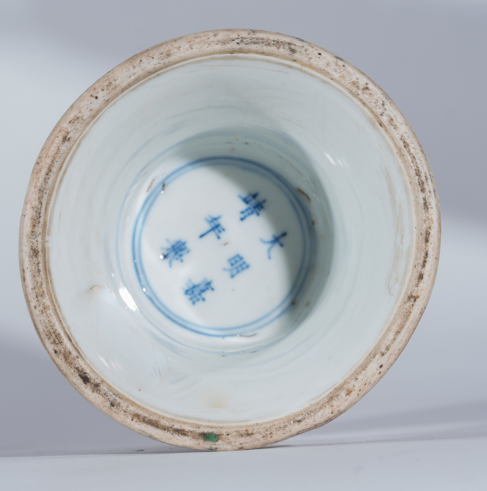 Inside the hollow base is a six character mark painted with blue underglaze within a double circle.